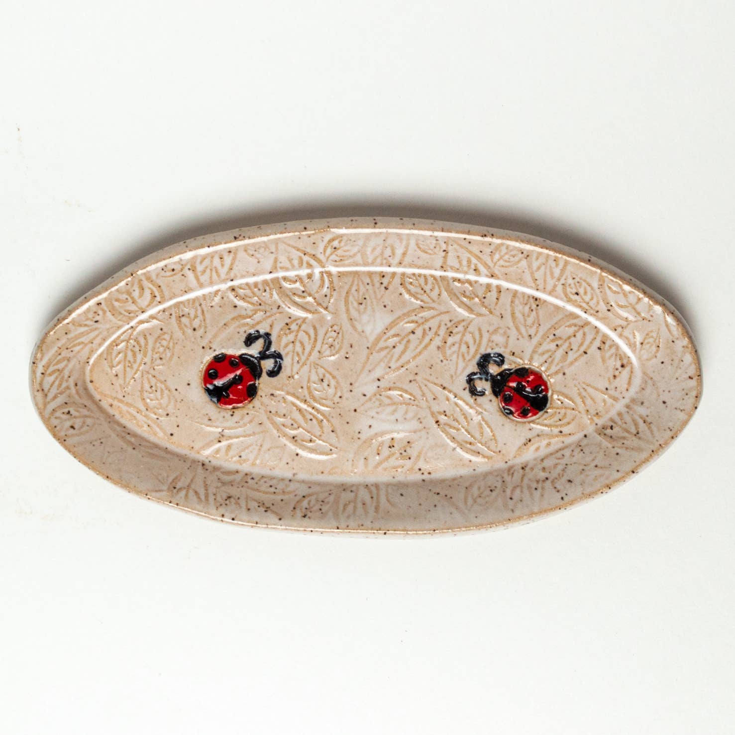 This charming ladybug stoneware oval tray adds a dash of nature’s cheer to your table. Hand-built and hand-glazed in our Oberlin, OH studio, it’s the perfect size—about 12" long by 4" wide—for serving snacks, holding treasures, or simply brightening your space. Food, dishwasher, and microwave safe, each tray is truly one of a kind, with its own subtle variations in color and character. Just like the lucky little beetle it features, no two are ever exactly alike.