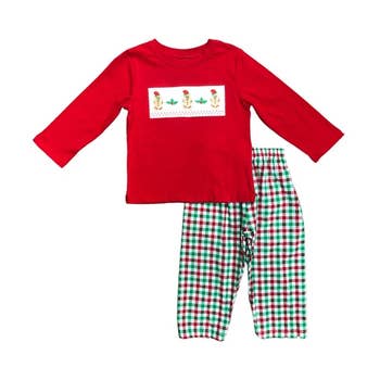Dress your little one in festive charm with our Christmas Tree Smocking Embroidered Boys Outfits. Featuring delicate smocking and intricate embroidery, this outfit combines classic style with holiday spirit. Perfect for family gatherings and holiday photos, it offers both comfort and timeless elegance to make your boy stand out this season. SKU:OFB40223 Top: 97% Cotton 3% Spandex Bottom:100% Cotton