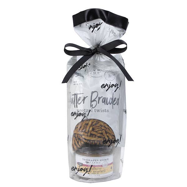 Our Grab and Go Gift Sets can be opened and enjoyed on the spot making them a great fit to send to everyone on your customer's list. Ideal for customers to Grab and Go right to the Holiday party. They may even grab 10 and go; one for everyone! Decorated Gift Bag with 1 Bag of Pretzels and 1 Jar of Dip or Jam, Bagged and Ready to Gift As Is Includes: Bacon Pepper Dip Butter Braided Pretzels