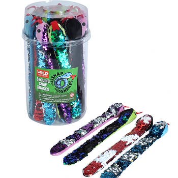 • Plush snakes with hard plastic eyes and a sequin-styled back • Brush the back to change the colors • Assorted colors (may vary) • Great gift shop item • Sold by the piece with a hang tag • Ages 3+
