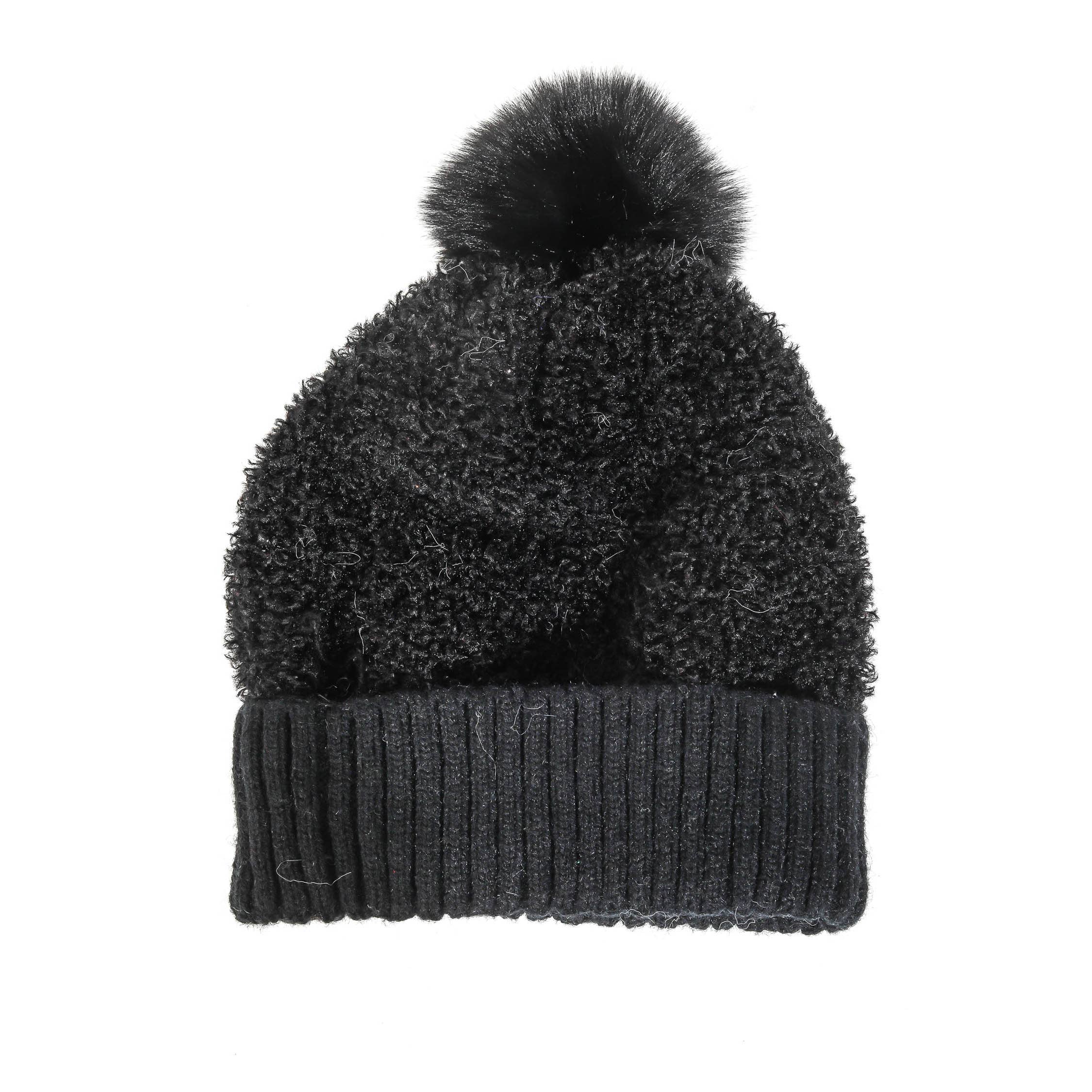 Double-layered merino wool with sparkle embellishments pressed into a mountain scene. Nature's peaks circle the entire beanie and are not distorted when the style expands with use. This design is finished with a black faux fur pom. Unlined.