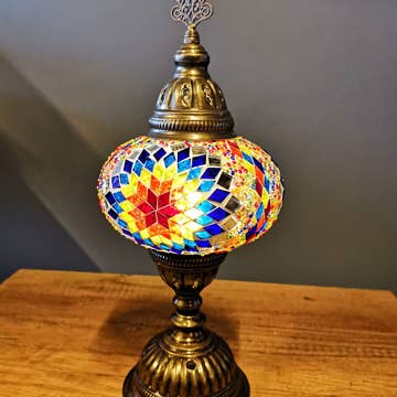 7" PRESSED MOSAIC SHADE "PEDESTAL" TABLE LAMP - BOXED - LED INCLUDED Each mosaic lamp is individually handmade in Turkey using high-quality materials and traditional craftsmanship. Our lamps feature double-layered mosaic glass shades with rich, vibrant colors and intricate patterns, ensuring no two pieces are ever exactly alike. Even when ordering the same color or style, variations in pattern and glass placement are part of the artisan process unless purchased as a matched set. All lamps include energy-efficient LED bulbs and are constructed using thicker metals, larger glass pieces, and durable components that meet or exceed international safety standards. Designed with a modular build, shades of the same size are interchangeable across compatible bases, offering flexibility for retailers and customers alike. With new designs and styles released regularly, these mosaic lamps make striking accent lighting for homes, boutiques, gift shops, and hospitality spaces while delivering consistent quality and timeless appeal.