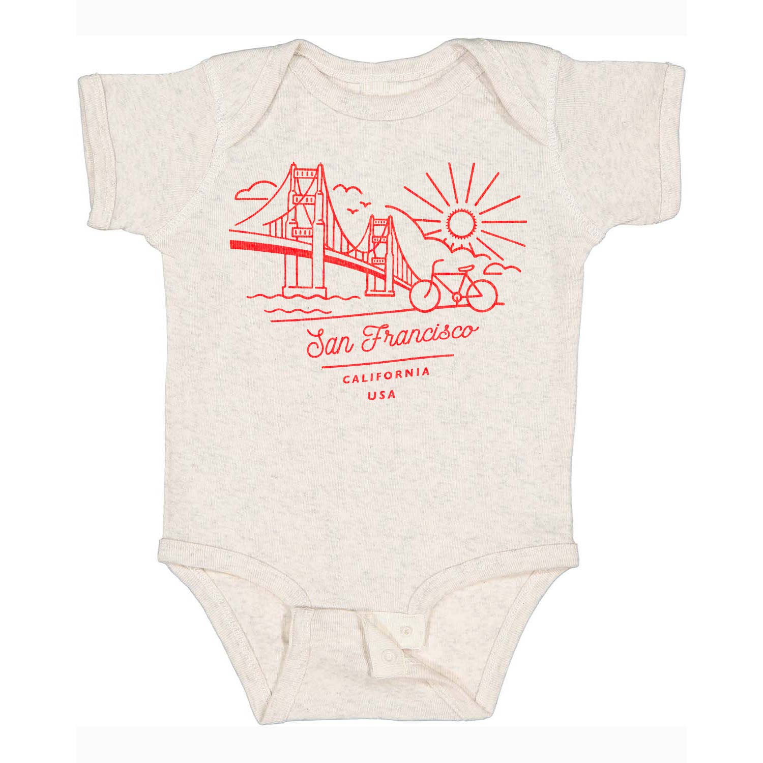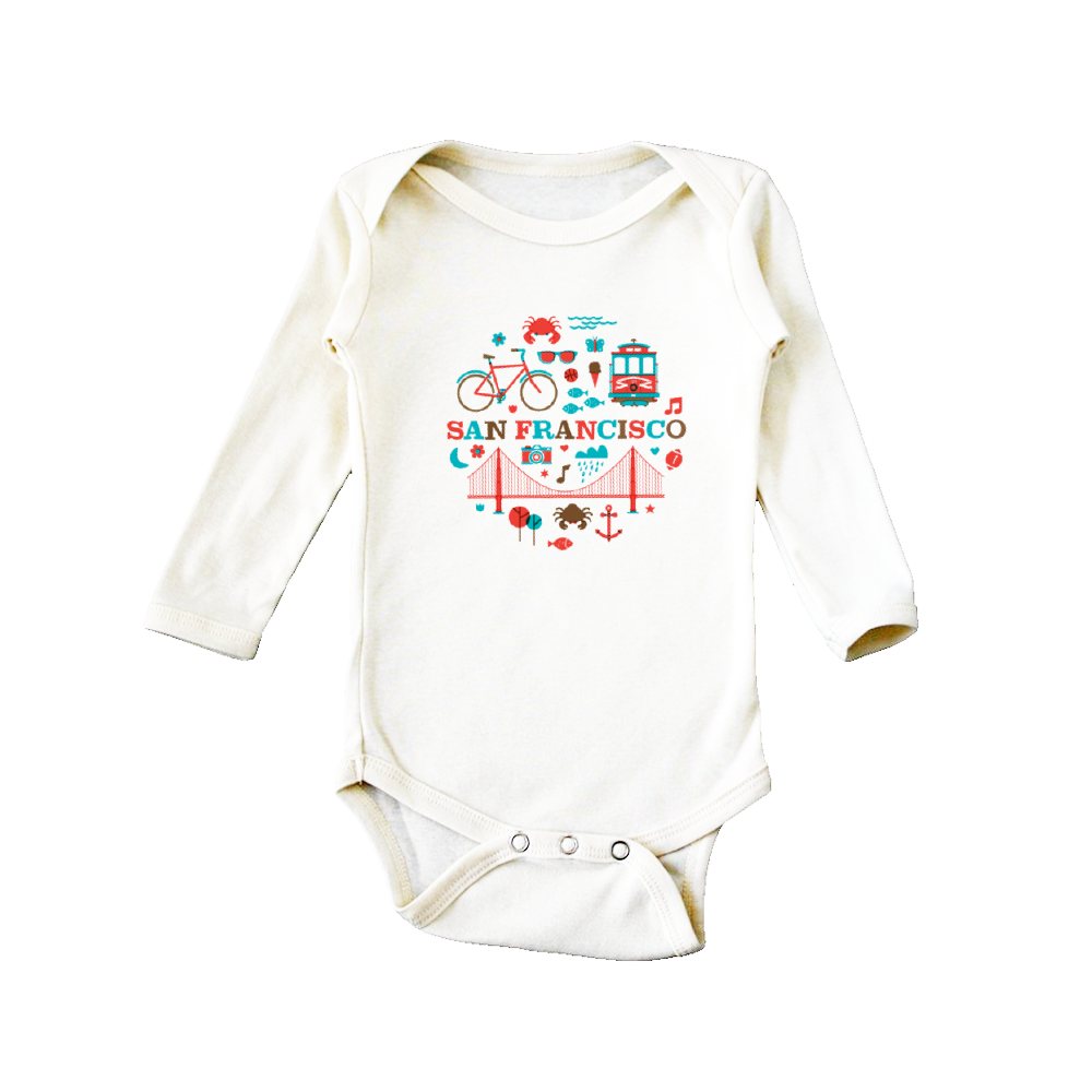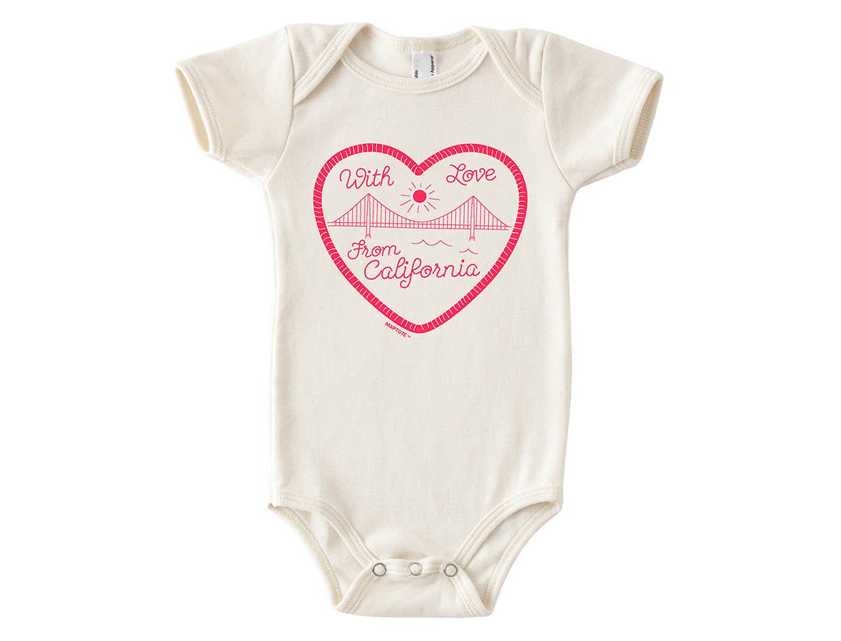 Show off Bay Area love with this cream baby onesie, featuring a bold red heart framing an iconic bridge and waves graphic. The playful design brings city pride and west coast vibes to your little one’s wardrobe. Snap closures at the bottom make for easy changes and all-day comfort. Fit This baby onesie features a snug yet comfortable fit with a lap shoulder neckline for easy dressing. The short sleeves and snap closure at the bottom make it practical for everyday wear while ensuring your little one stays cozy. Fabric Made from 100% ringspun cotton, this onesie is luxuriously soft and gentle on delicate skin. The breathable fabric provides all-day comfort, an easy choice for your baby’s wardrobe. 6 oz. 100% organic ringspun cotton