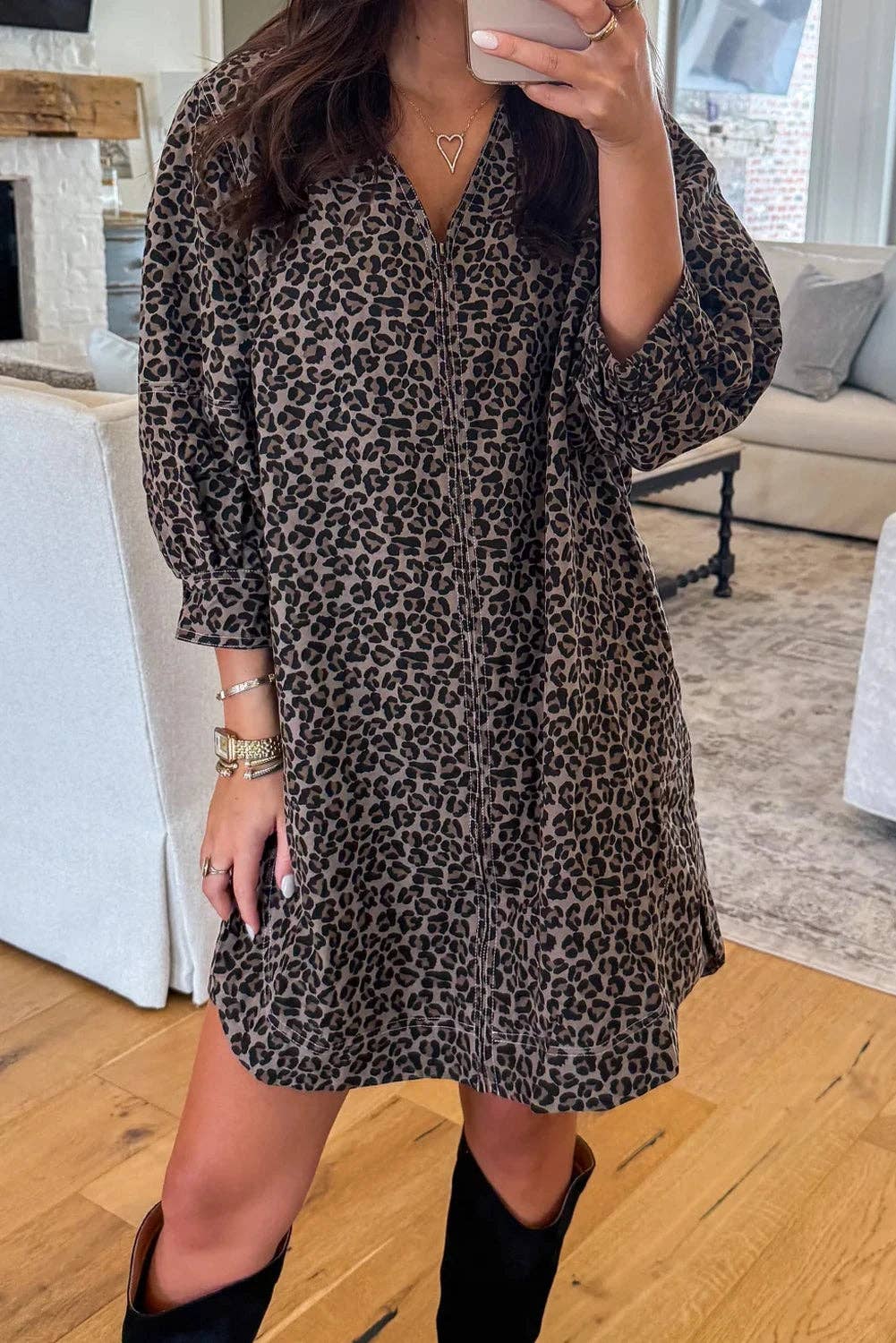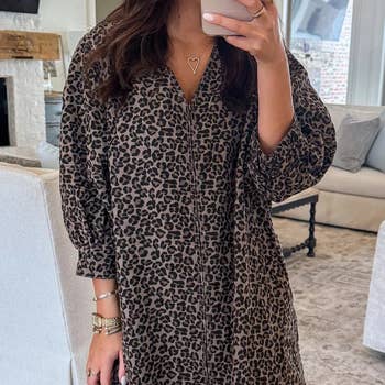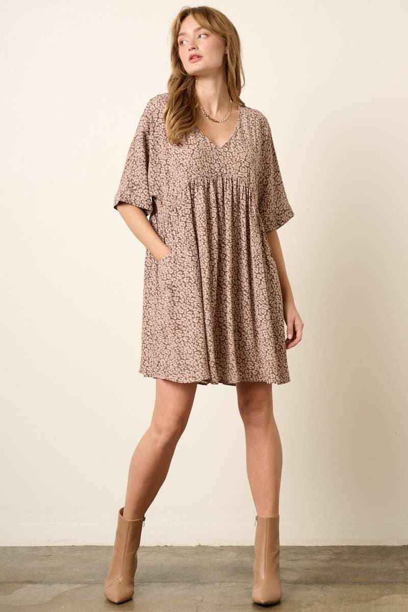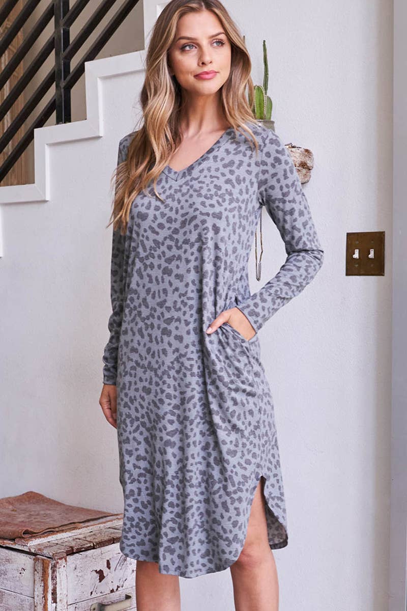 Leopard print tee dress V-neck, drop shoulder, short sleeve, side pockets, round hemline Size+Fit - The model is 5'9" and wearing size small - easy to wear - relaxed fit Made in USA