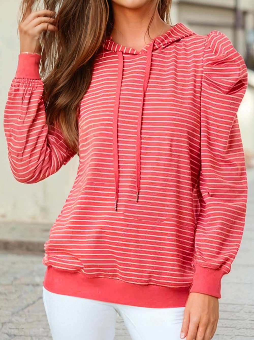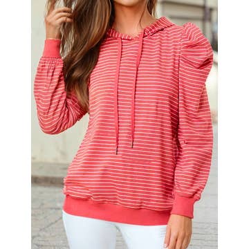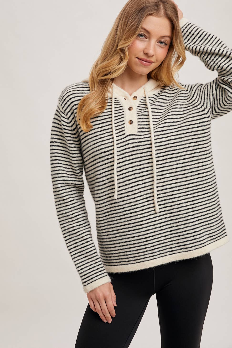 HENLEY RIBBED HOOD TOP - Stylish striped Henley hoodie featuring a classic button placket design and drawstring hood - Contrasting solid cuffs and hood trim - Partial button-up front with 4-button placket - Long sleeves with thumbhole cuffs STYLE MEASUREMENTS (SIZE SMALL) - TOTAL LENGTH 26 1/2" - BUST 17" - WAIST 16" - SLEEVE LENGTH 26 1/2" - SHOULDER 14 1/2" 95%COTTON, 5%SPANDEX | CONT:47%COTTON, 46%RAYON, 7%SPANDEX MODEL IS 5'7 1/2"| BUST 33"| WAIST 24"| HIPS 34"| WEARING SIZE SMALL