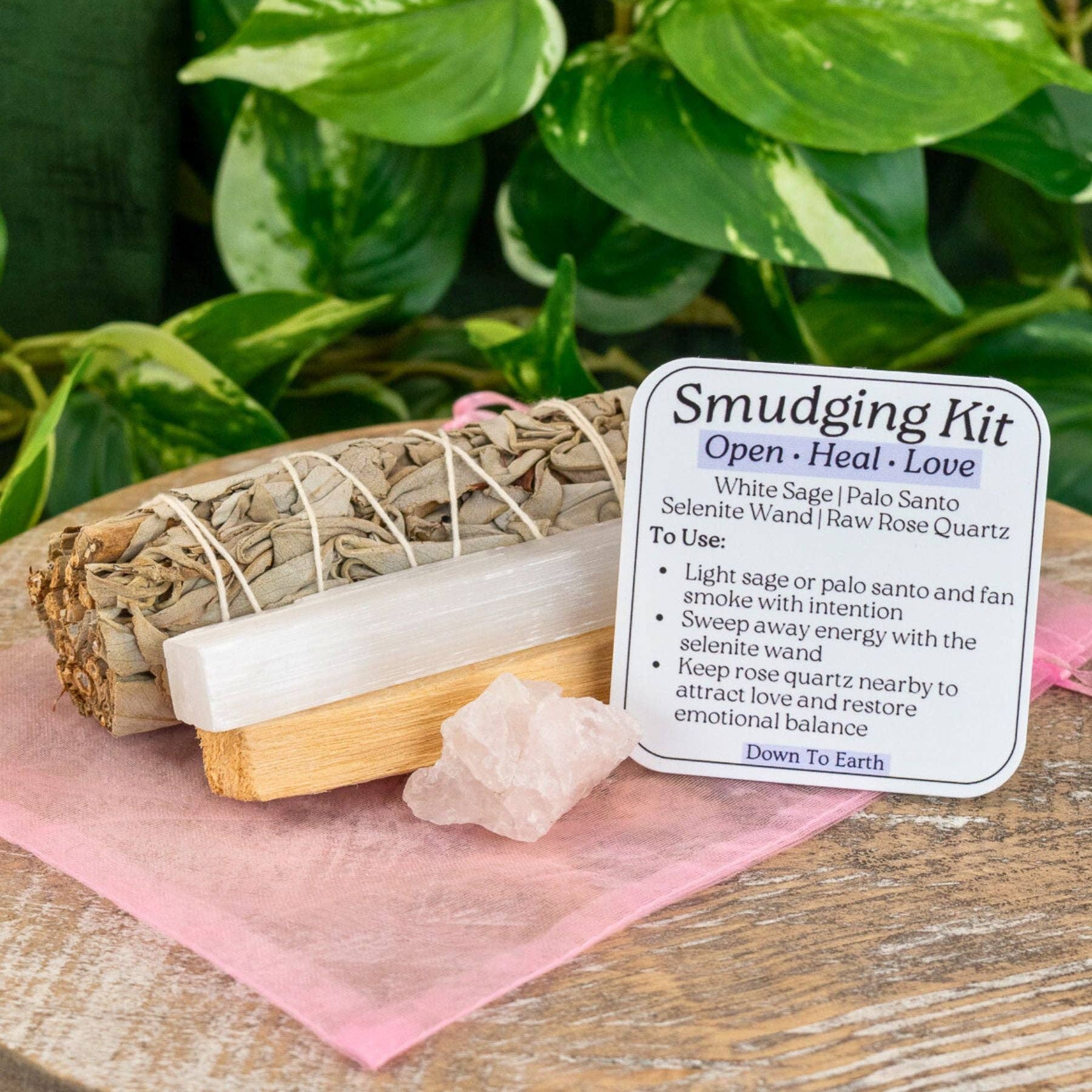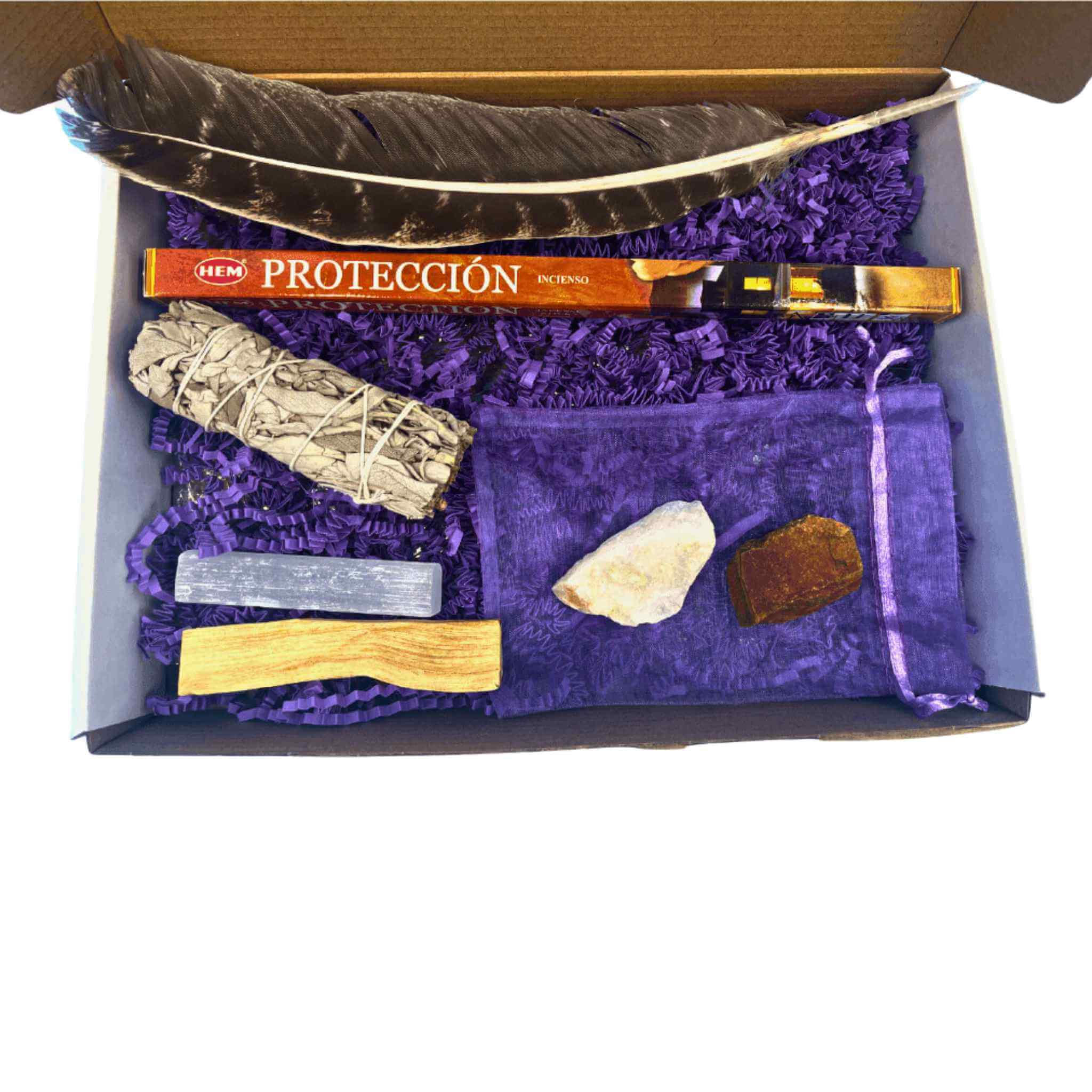 This sage smudge kit is the perfect smudge kit for beginners! It Includes: * 1 Organic White Sage Stick-bundle 4-5" * 1 Palo Santo Incense Stick 4" * 1 Selenite Wand Raw 4" * 1 Raw Amethyst Crystal * 1 Purple Organza Bag * 1 Detailed smudging Guide White Sage -Sourced by sustainable growing methods and eco-friendly practices Palo Santo- Palo Santo, or the “holy wood”, is used to enhance spiritual practices, dissolve negative energy, and combat unwanted entities. Sourced by sustainable growing methods and eco-friendly practices Selenite- Selenite is the ultimate energy tool to purify, clear and cleanse your crystals, tarot deck, altar or your environment. Amethyst is an extremely powerful and protective crystal with an immensely high vibration stemming from its deep purple hue. It balances our mind, body and spirit leaving us feeling centered and grounded, while converting our scattered thoughts into focused ideals. Amethyst is a wonderful crystal to wear or keep at the office as it repels all forms of negative energy from the environment. Amethyst links our physical, mental and emotional energies to the Spiritual. This cleanse and revitalizes our Aura, raises our vibration and connects us to the endless love of the Divine, while providing insights into our true-nature and encouraging us to seek Spiritual wisdom and guidance. It is very beneficial to the brain, as it can both calm and stimulate based on what is needed at the time. Amethyst can also enhance our memory and improve our motivation to achieve the goals we have set for ourselves. In addition, Amethyst dispels anger, rage, fear and anxiety making it an excellent stone to sleep with to avoid nightmares. Chakras: Third Eye & Crown Astrological Signs: Virgo, Sagittarius, Capricorn, Aquarius & Pisces Element: Air