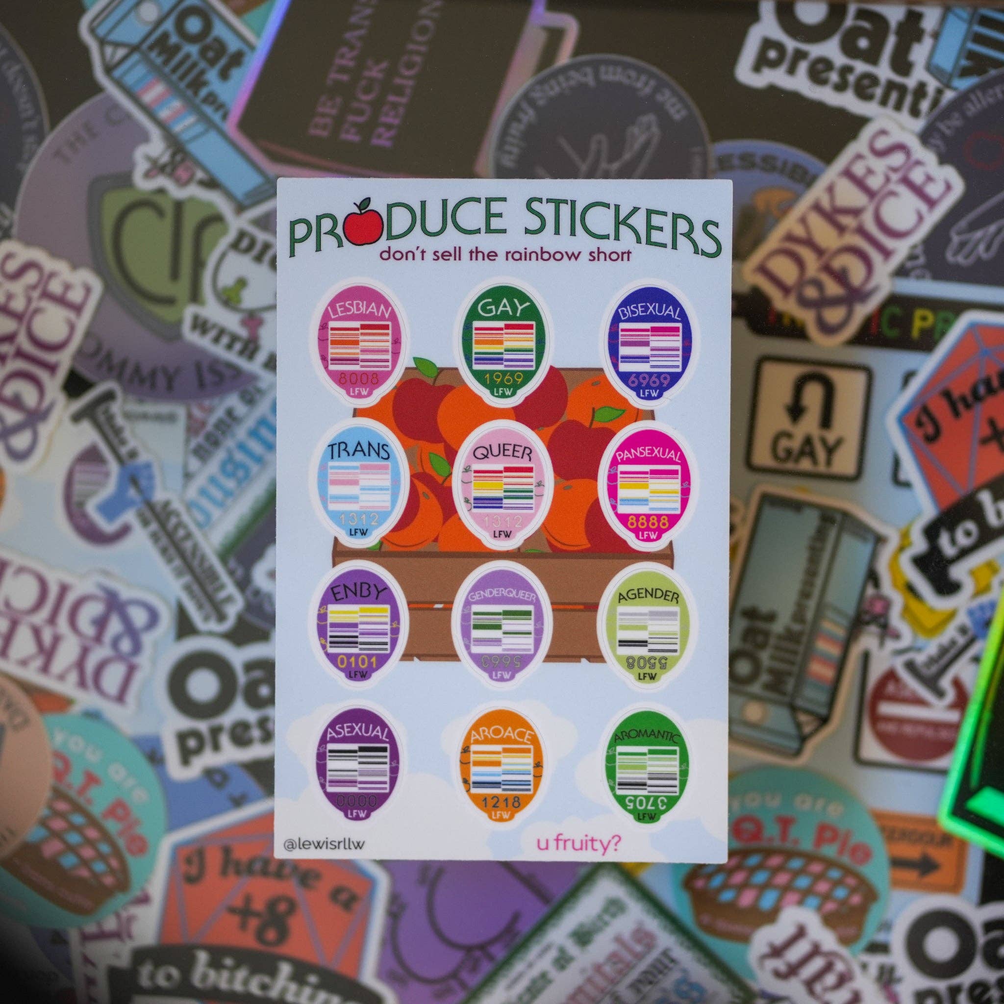 Show your fruity pride like never before with Produce Pins! A play on produce stickers, these 1.25 inch soft enamel pins are made with a pride color coded barcode and fake but purposefully themed PLU number. Don't sell the rainbow short! Get your identity on a pin today! U fruity? More identities coming soon!