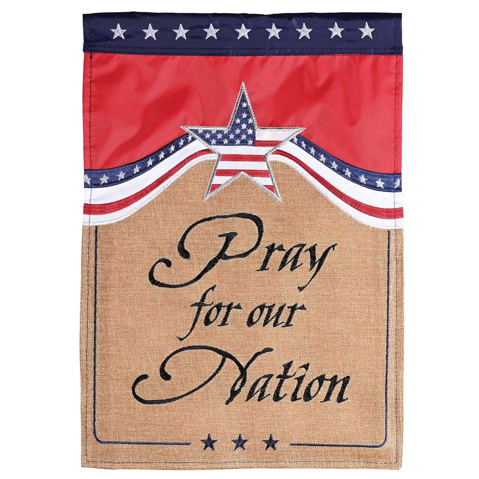 Garden size Double Applique flag is 13 x 18 inches. The design is a combination of fabric appliques and exquisitely detailed embroidery. Design is on both front and back of this 300 denier polyester double thickness flag. These flags are heavier than most others on the market and will hold up longer. Double applique flag fabrics are either satin-smooth or a burlap texture; sometimes a combination of both. Flag will retain its color and beauty for years if displayed in shade or semi-shade, and is rainproof. Flagpole not included.