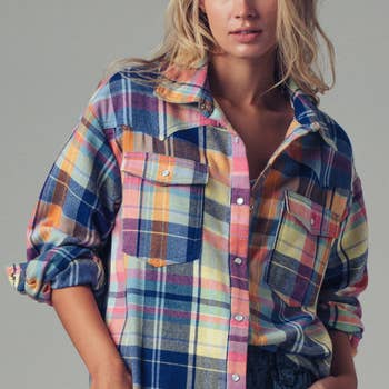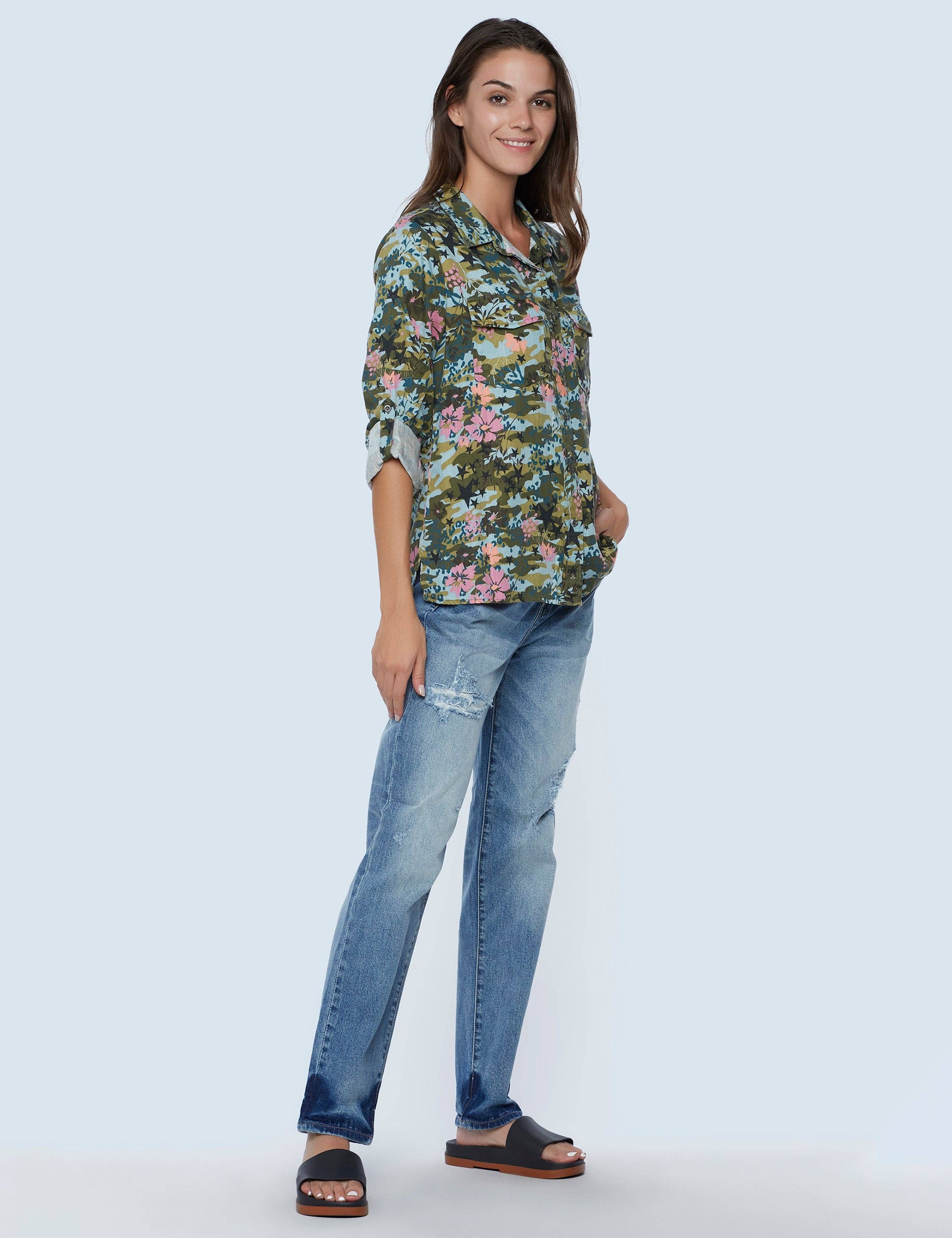 Immerse yourself in the vibrant charm of APNY's Colorful Ombre Print Button-up. This women's button-down shirt captivates with its eye-catching ombre print, effortlessly transitioning from one hue to another. Designed with roll-up sleeves, it provides a versatile style that suits your every mood and occasion. Born from a passion for fine fabrics and commitment to the environment, APNY ensures premium quality in every piece. This shirt is a testament to our vision - creating designs that stand out and empower women.