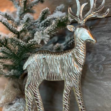 This wrapped wire reindeer features beautiful gold antlers a top a silver wire frame. The contrast between the rustic wire and the gleaming gold creates a captivating harmony, infusing the reindeer with a sense of magic and wonder. Whether perched atop a mantle or gracing a holiday table, this charming decoration is sure to captivate hearts and spark imaginations, inviting all who behold it to embrace the joy and spirit of the season. Wire and metal crafting is made by artisans at Johra & Bohra Handicrafts in Behat in the northern state of Uttar Pradesh, India. These products are all wrapped by hand and our artisans are always learning and designing new shapes for use. Made from reclaimed metal wire Frame is soldered for durability Wire is wrapped by hand around frame Coated in protective layer Size: 6" L x 4.5" H Keywords: reindeer, Christmas, holiday, seasonal, winter, hand made, wrapped wire, silver, gold, fair trade, India, home decor, seasonal decor, holiday decor, gift