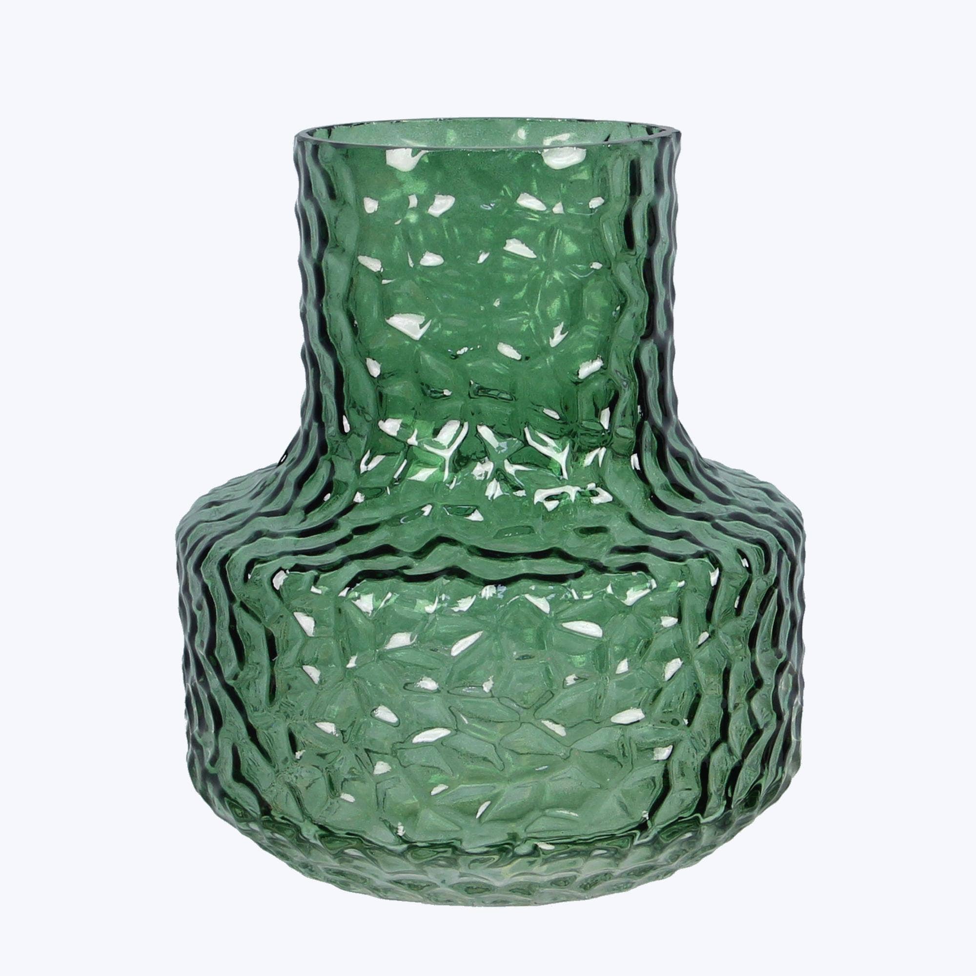 Textured cylinder floral vase décor Available in two colors: Clear and Blue Available in three sizes: - 18-0834: Height = 5.5" | Diameter = 4.35" - 18-0835: Height = 7.5" | Diameter = 4.35" - 18-0836: Height = 9.5" | Diameter = 4.35"