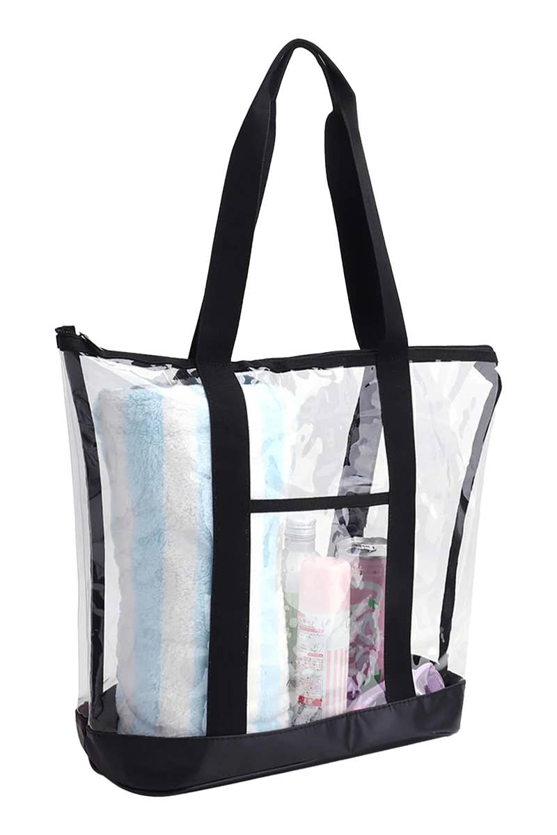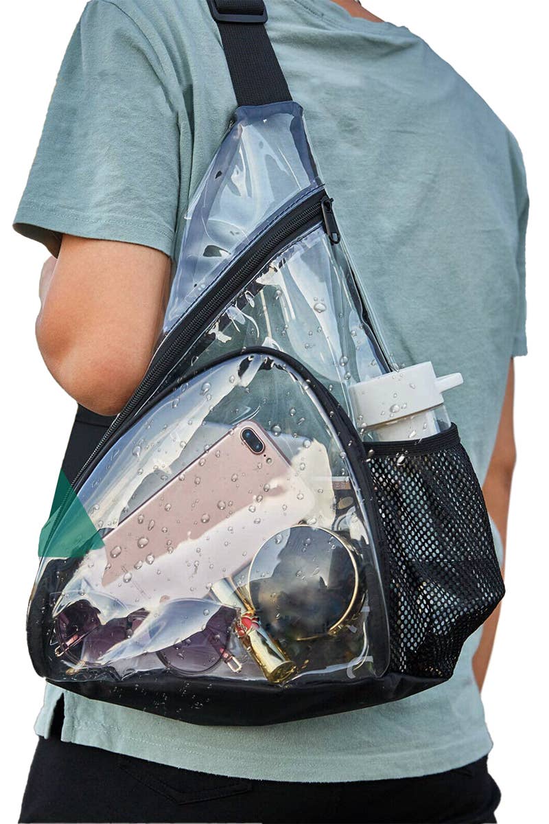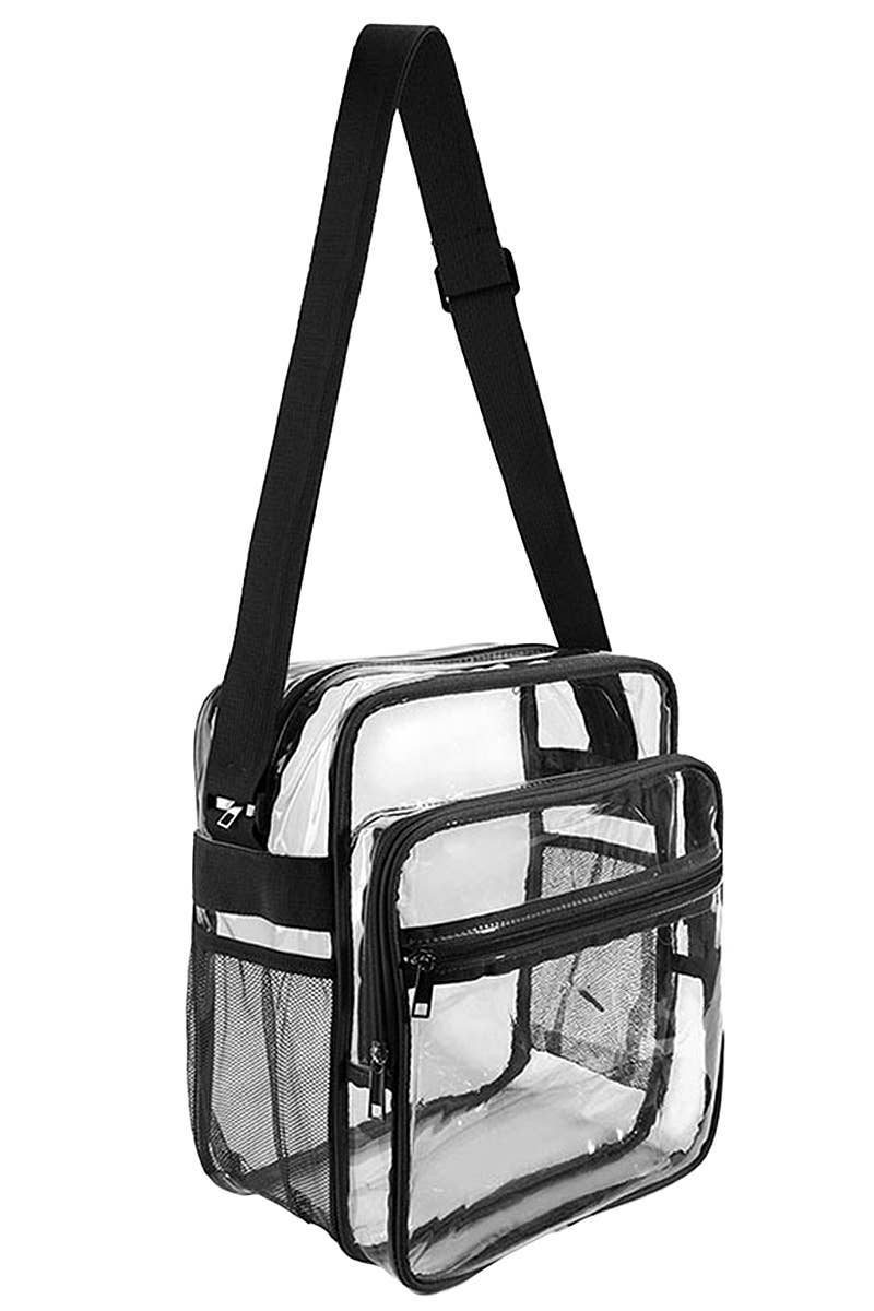 Extra Large Capacity Transparent Clear PVC On The Go Travel Storage Tote Bag -Stadium Approved -1 x Zipper Closure Main Compartment -1 x Frontal Zippered Auxiliary Pouch -2 x Auxiliary Mesh Water Bottle Sleeves -Detachable and Adjustable Strap Length: 26" - 52" -Dimensions: 11.5" * 7.75" * 2" -100% PVC -CA Prop 65 Advisory