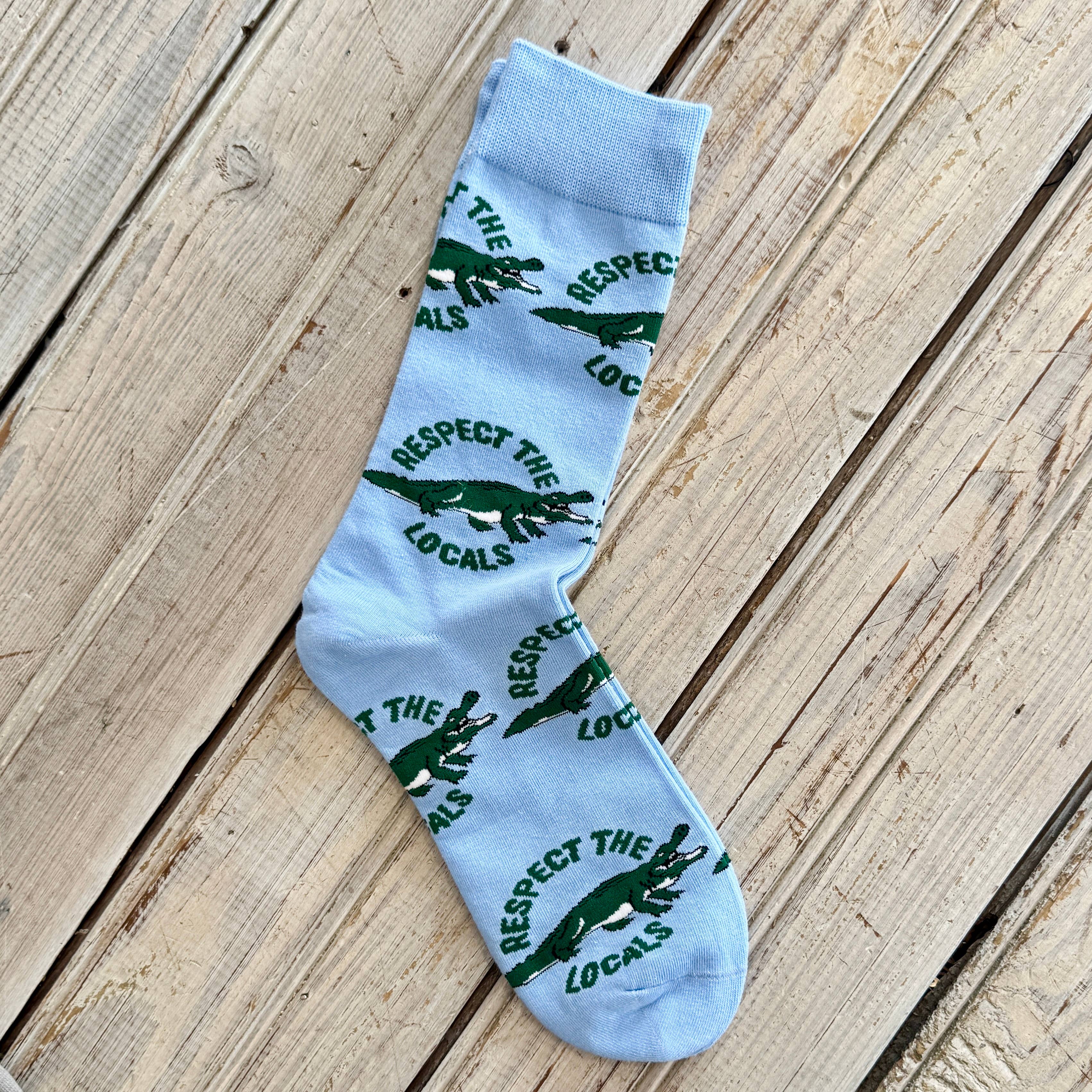 Unisex Cotton 75%, Poly 23%, Spandex 2% New Orleans & Louisiana inspired socks Blue background with white outline LA (Louisiana) Gator Designed in NOLA We sell all of our products in our New Orleans retail Jeantherapy stores, with tried and true sell-through. Keep checking back for new items!