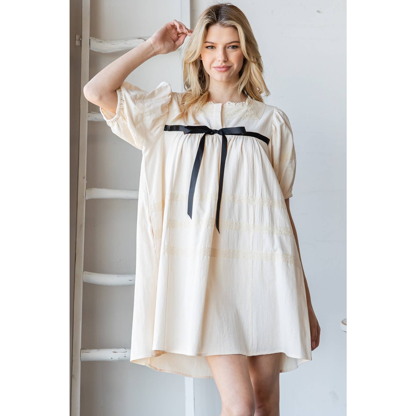 Half-Sleeves: Designed for comfort and a flattering fit, making it a versatile addition to your wardrobe. Lace Trim Detail: Adds a delicate touch of femininity and sophistication, enhancing the overall appeal. Soft Fabric: Made from high-quality materials, ensuring both comfort and durability. Relaxed Fit: Flows gracefully, making it both stylish and comfortable for various body types. Model is wearing a size S Model : 5'8" - B 32" - W 24" - H 35.5"