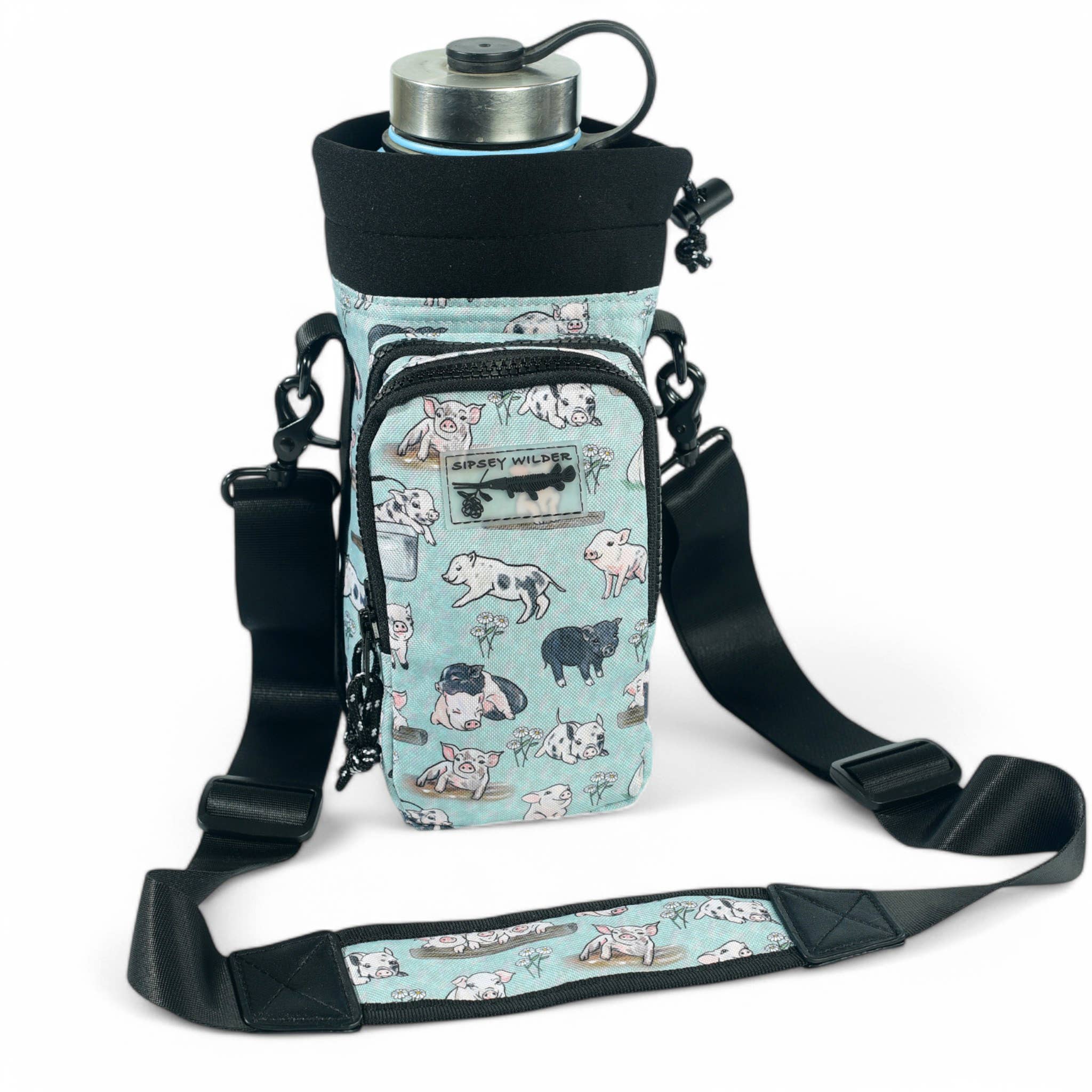 Calling all cow lovers! You will be over the moon for our adorable new dairy cow print! Great for taking to the gym, a hike or around town! This versatile water bottle carrier comfortably fits a 4-inch diameter water bottle. You can store your phone, keys and other small items in the two front zip pockets. It includes a clip on adjustable strap with matching shoulder pad. Clip off the strap and use the back slots to slide your own belt buckle or bag strap through for a waist wearable option! It also has two side handles for easier use when drinking from the carrier and a cinch cord top if you want to close the opening. -9.5" tall x 6" wide x 4.25" diameter -Includes adjustable clip on strap, slots on the back to slide a strap or belt -2 attached 4" x 6.5 " x 1" deep zip pockets -cinch closure top -YKK zippers -Made with 100% recycled polyester & water resistant coating. Neoprene liner to absorb bottle sweat. 💧♻️ *shown with optional waist strap sold separately.