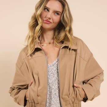 A utility jacket featuring button-front closures, hidden drawstring belt, long sleeves with roll tab cuffs, chest flap pockets, slant pockets and a basic collar, relaxed fit. -Model is 5'9" and wearing a S/M