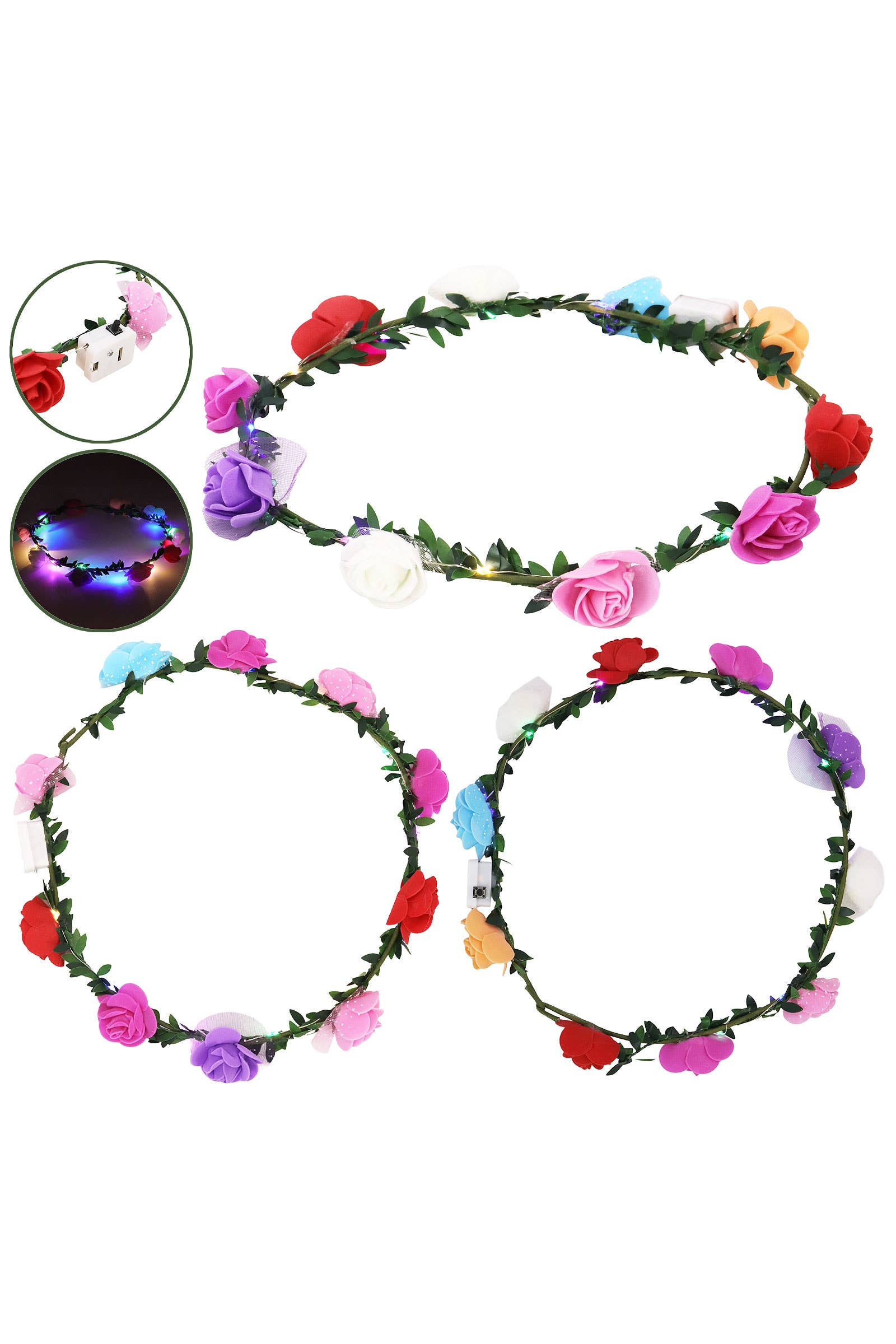 Adorn yourself with a crown of vibrant, glowing flowers! Show off your flower-power at your favorite concerts, music festivals, and events. Little Light Lab's flower crowns will light up the night with one of three settings for up to twelve hours on one set of batteries.