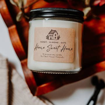 Home Sweet Home Soy Candle-Is there anything better than the feeling of relaxation and safety you feel when you get home after a long day? This candle embodies that cozy and relaxing feeling only experienced when you are in your happy place called home. This candle makes for a great house-warming gift! Scent Notes-apples, cinnamon, vanilla Size Options- 8oz clear glass jar Aside from the all-natural ingredients, all of our candles feature a unique description that is meant to transport you to a relaxing place! Materials-We use a natural soy wax, cotton wick (lead and zinc free) which is self trimming and clean burning, and phthalate free fragrance oils. Glass canning jar is reusable! All of our candles are hand poured with love by me in my home in Bucks Country, PA!