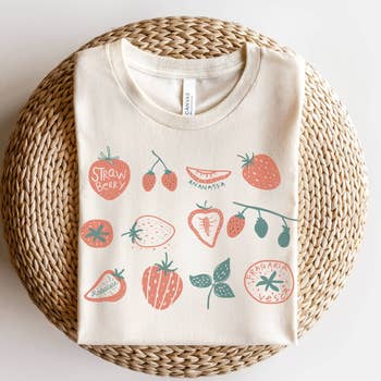 A summer best seller! 🍓 Growing + harvesting the goodness of the Fruit of the Spirit 🫐🍒 Printed on an off-white 100% Comfort Color tee Front: Strawberry patch in left corner Back: graphic across the back Summer Collection / Fruit Collection / Farmer Market Summer Graphics