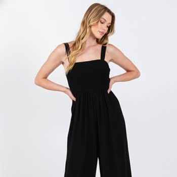 SKU: VP60592-Black-S, VP60592-Black-M, VP60592-Black-L Made in United States Aesthetic: Casual and Glam Care Instructions: Hand wash Embellishment: Ruffles Fabric: 97%Polyester 3%Spandex Fit: Contemporary and Missy Occasion Theme: Everyday and Holi Occasion: Everyday and Resort / Vacation Pant Length: Floor Pattern: Solid Rise Style: High Season: Spring/Summer Sleeve Length: Sleeveless Product Language: English and Spanish
