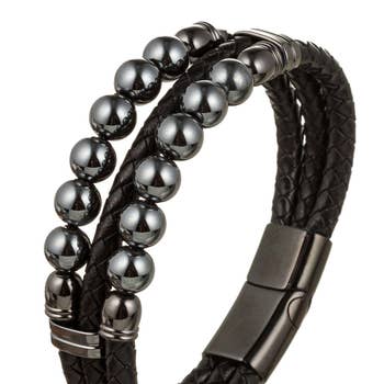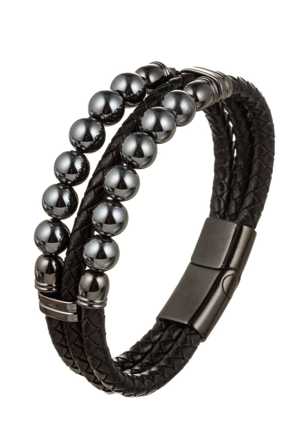 Stainless steel genuine black leather cuff bracelet (19.5 mm) - 8". Wear this rugged yet sleek black leather bracelet. The eye catching bracelet is the perfect accessory for business or leisure. The 8 inch bracelet secures with a stainless steel magnetic clasp.