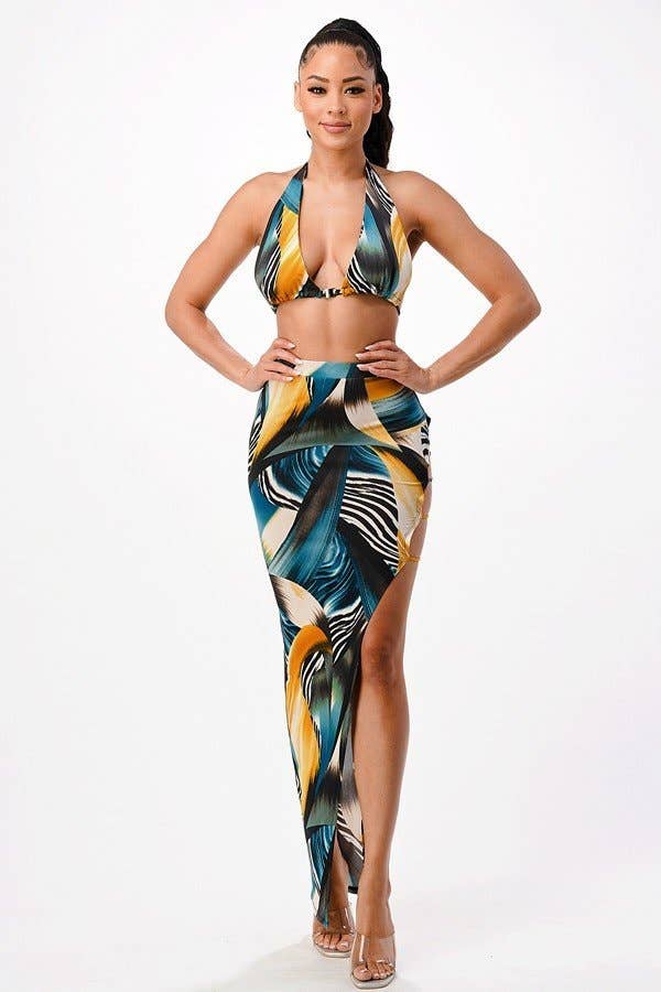 Tropical Waters Print Mesh Ruffle Halter Skirt Set
