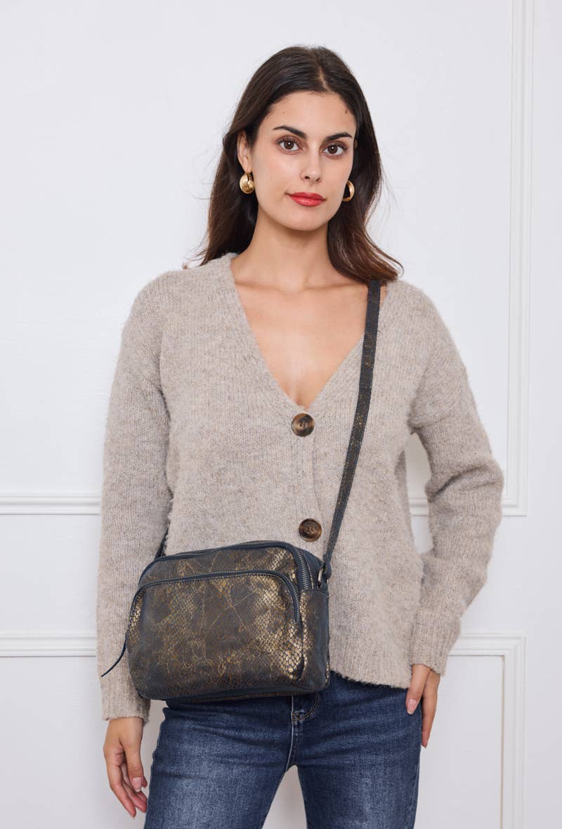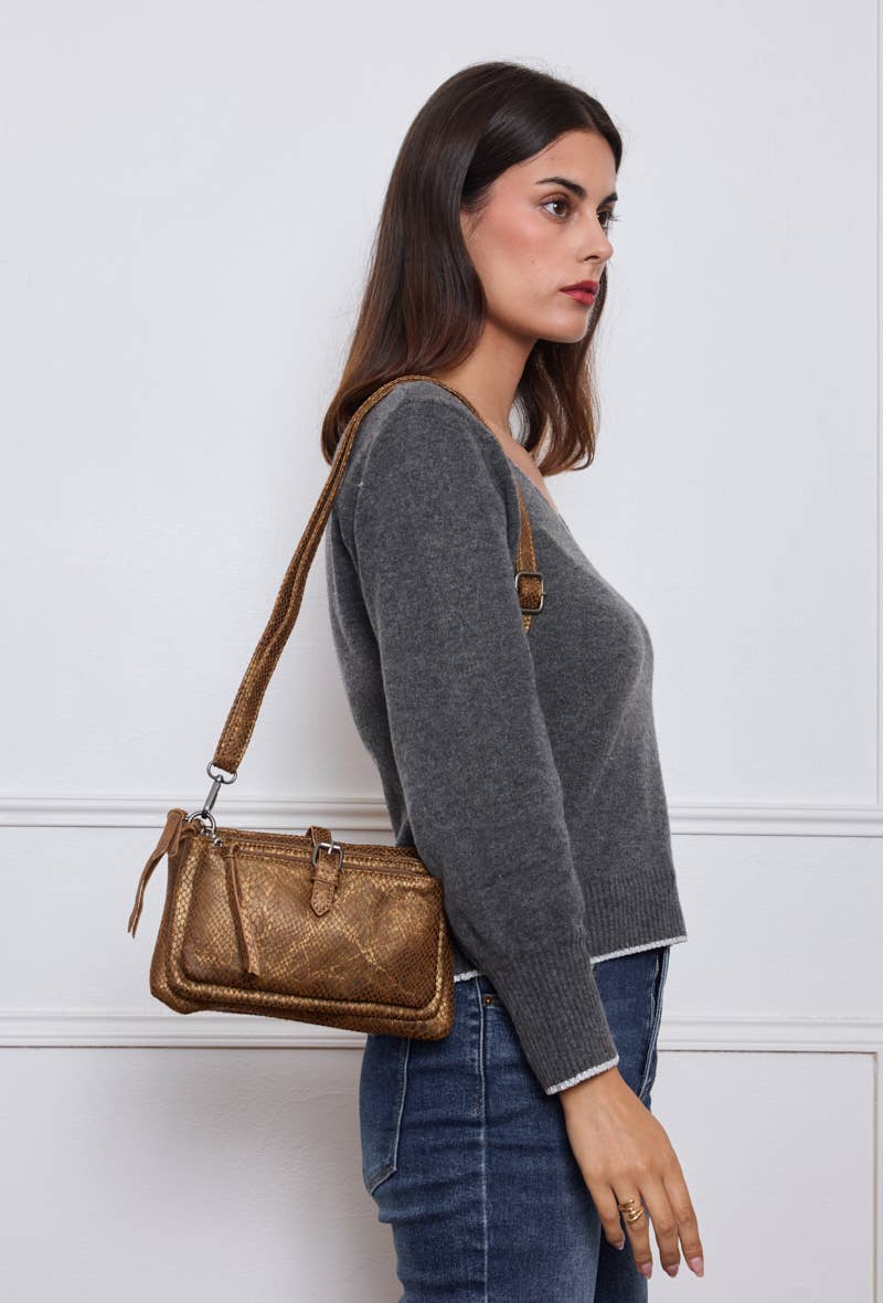 Shoulder bag with front zip Long shoulder strap included Large main compartment with interior zip pocket + back pocket