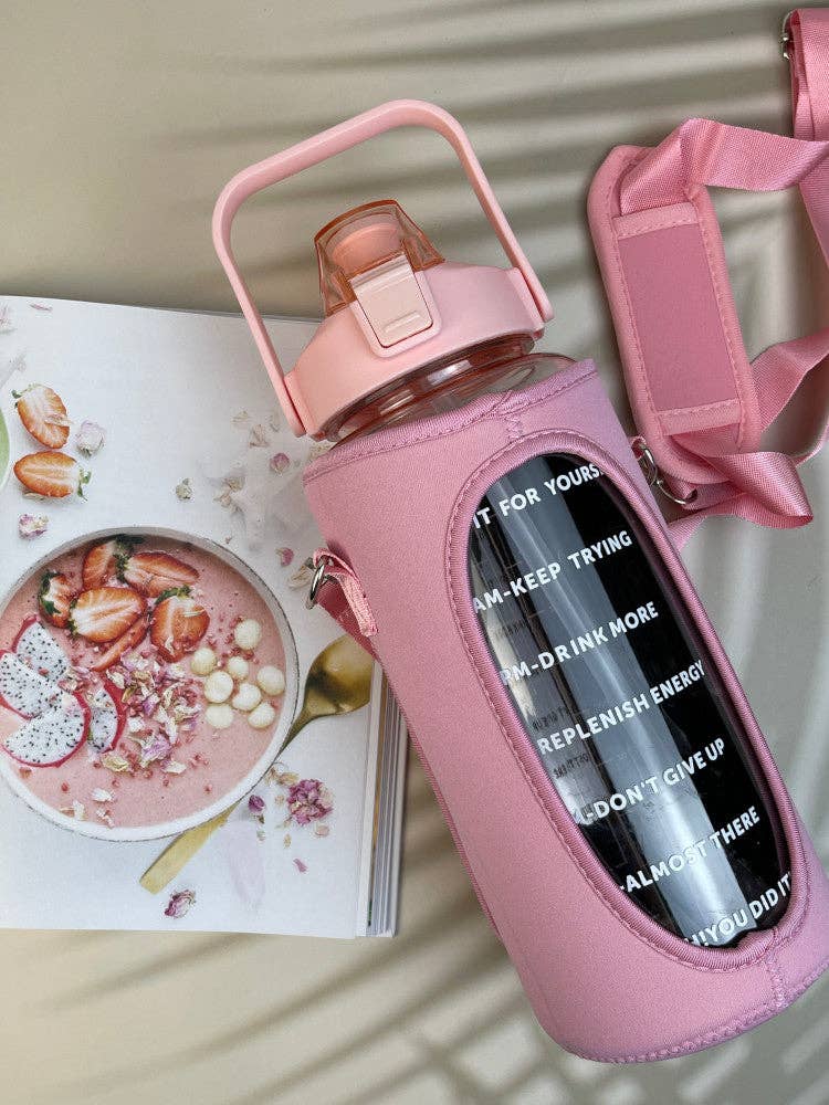 Sip your way to success in style with this two-in-one Motivational Drink Bottle + Crossbody Bag! Chill (literally) while you reach your goals, and show off your fashionable #goalslayer look. Fill up the 2L bottle and stay hydrated while you hustle, carrying your goals in the sleek and stylish pink floral neoprene crossbody. Now, that's what we call livin' your best life! Drink Bottle Capacity: 2 Litres Size: 34cm high including handle x 11cm Wide Neoprene Strap Length: 115cm - Maximum Strap Length approx. Removable neoprene sleeve and detachable shoulder strap BPA Free, No Chemical Smell Removable & Detachable Straw Wide mouth piece, ideal for ice, fruits or protein shakes etc Food grade silicone O - ring prevents leaks One push easy lock / unlock Phone Holder, Key Clip & Credit Card Holder Material: Food Grade Quality Tritan Made In China