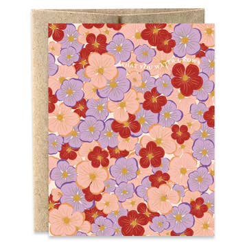 Blush peonies, clusters of deep indigo grapes, red berries, and white blossoms scatter across a rich golden amber background, painted with loose, confident brushwork that feels both abundant and effortless. Warm, jewel-toned, and impossible to overlook. No text on front. Blank inside. Matching envelope. Printed on 100% recycled paper, made with wind power in the USA. Perfect for gift shops, boutiques, bookstores, and garden centers.