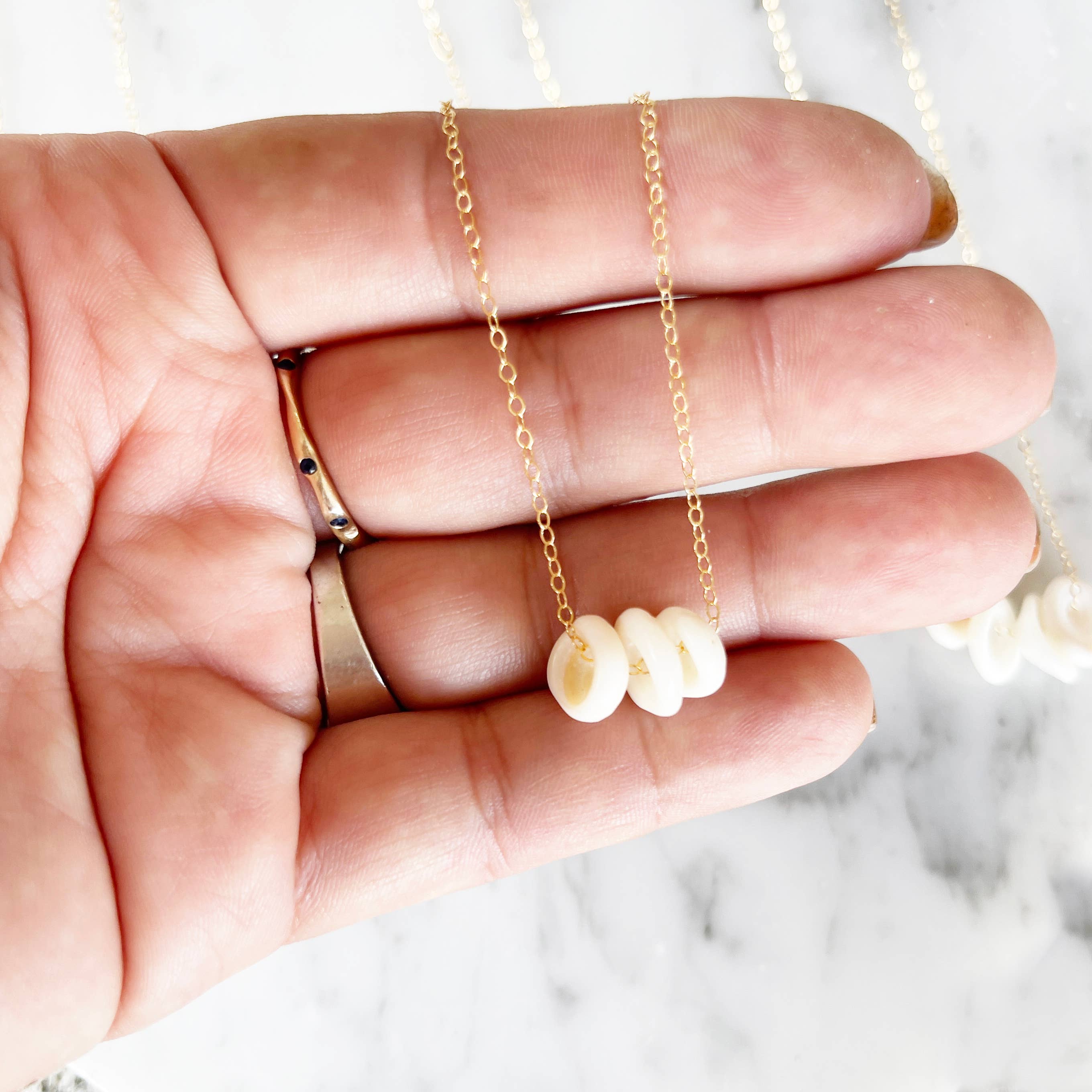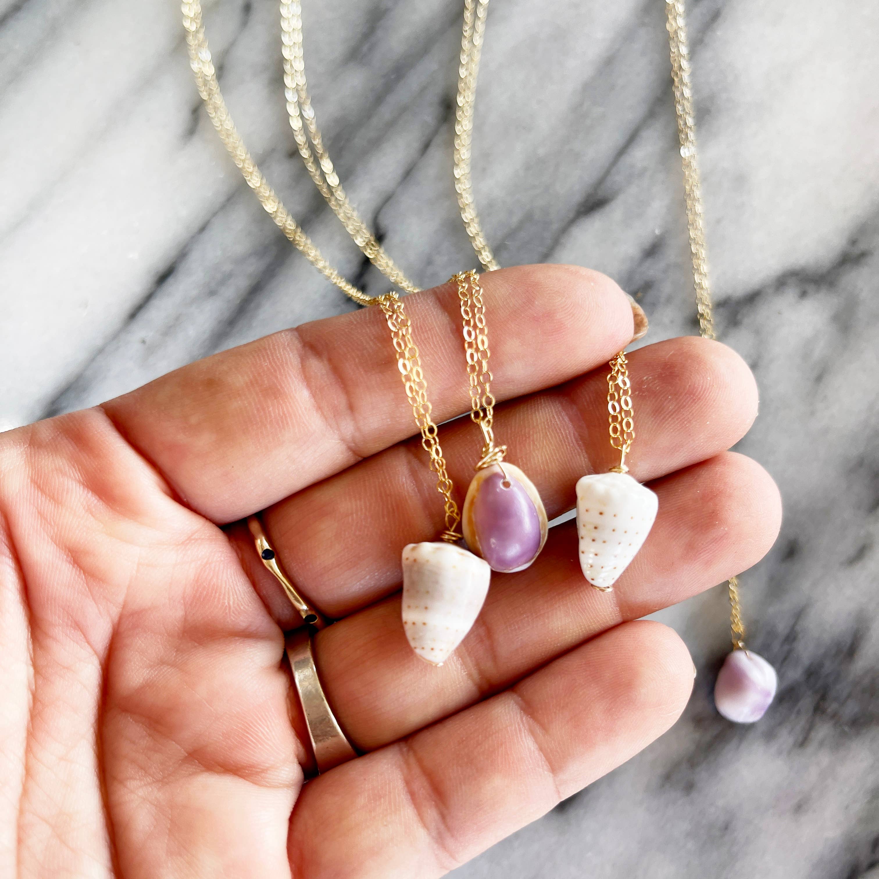 One of our bestsellers! Assorted Mini Hawaii shells on your choice of tarnish-free 14kt gold fill or Sterling Silver chain in adult standard 18" length. Shell variation will vary-- all shells under 3/4" in size, with variations between cone shells, drupe shells, miniature cowries and other shells found while diving here in Hawaii.