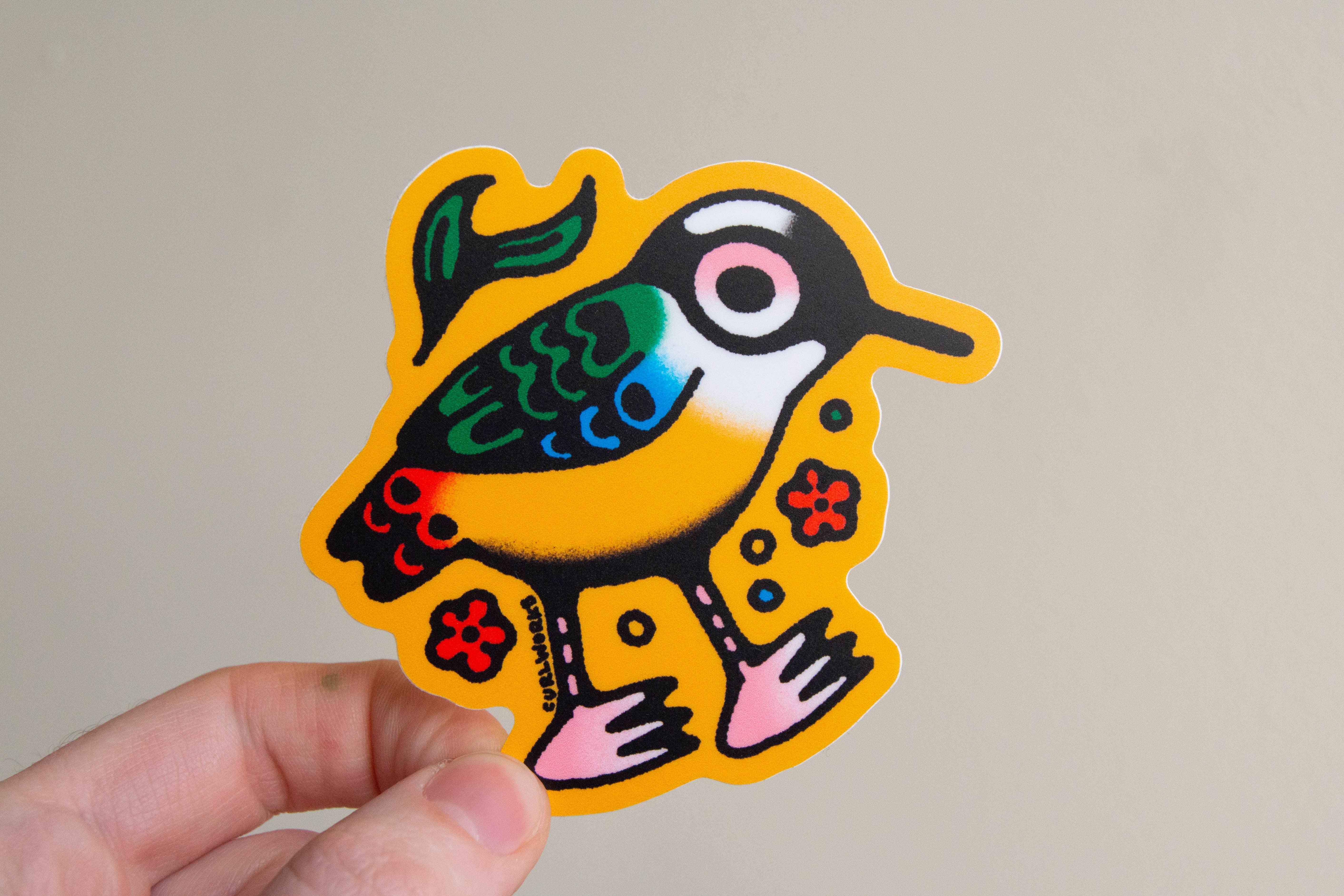 This happy ukulele bird is ready to come with you wherever you go! She is one of Gianna Pergamo's original illustrations replicated in beautiful bright colors on high quality vinyl. Feel free to stick it on your car or bike, it can go outside! It's also rated to last 3-5 years without fading. 4" tall.
