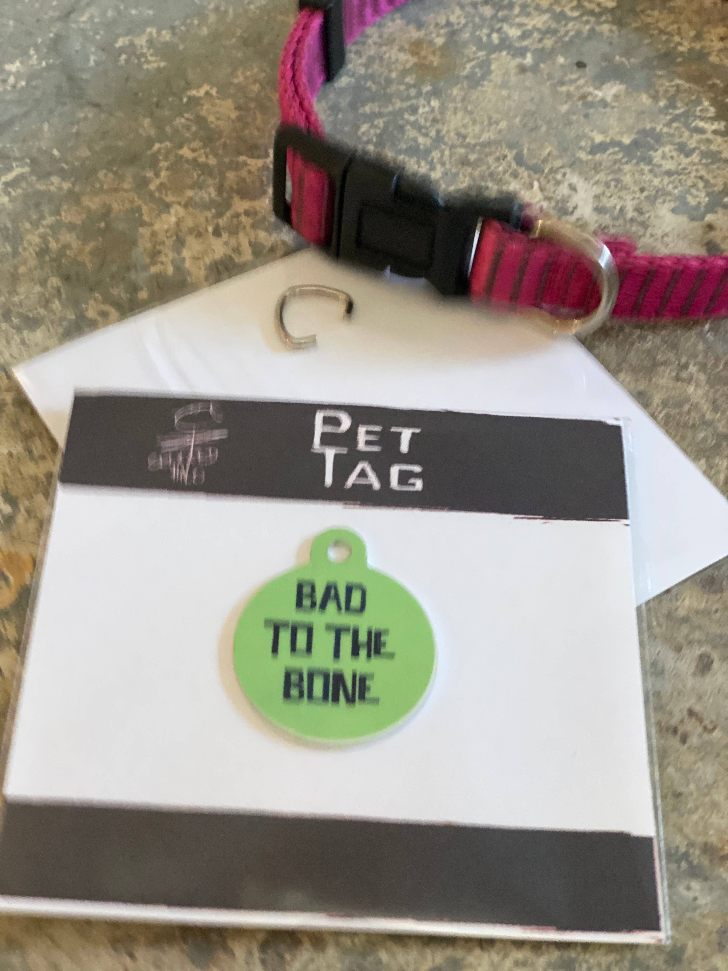 1.25" round Metal Pet tag. Sassy and Fun! Triangle clasp included. They come packaged in a resealable cello bag to keep them protected!