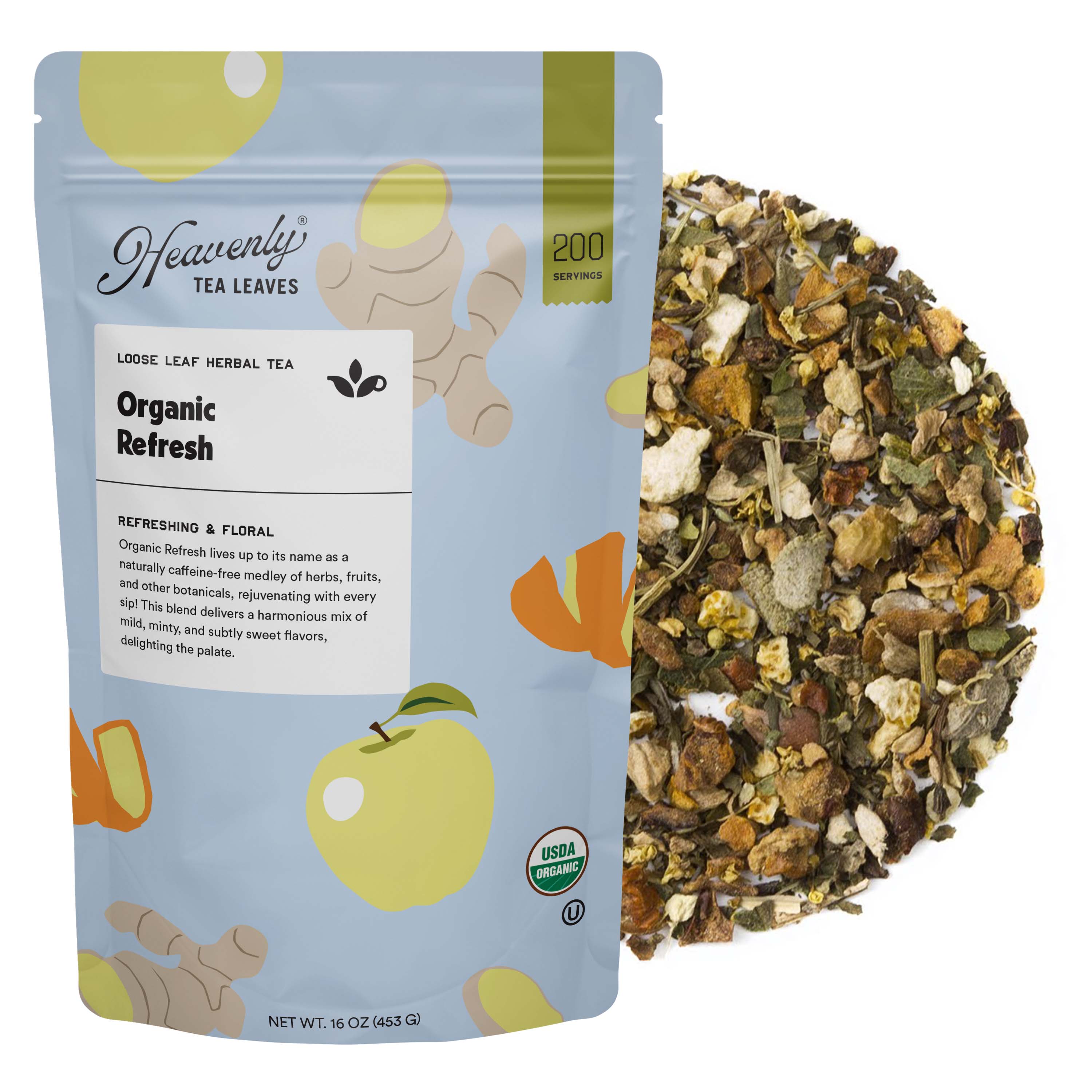 Made in United States Diet: Alcohol-free, Dairy-free, Gluten-free, Grain-free, Ketogenic, Sugar-free, and Vegan Production: No artificial sweeteners, No preservatives, and Non-GMO Season: Year-Round Shelf life: 6–12 months Storage: Shelf-stable Product Language: English Ingredients: All organic: ginger, mango, *lemongrass, orange, lavender, honeybush, elder flower, and *vanilla over red and green rooibos. Anti-inflammatory, antioxidants, relaxing, aids digestion. *DIRECT IMPORT/SMALL FARMS Weight: 96.39 g (3.4 oz) Dimensions: 5.1 x 13 x 20.3 cm (2 x 5.1 x 8 in) Product Materials: Refill Packaging: Recyclable Production: Ethically sourced
