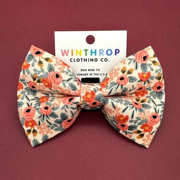 Modern florals in a vintage inspired palette. It’s easy to see why this print is a best-seller all year round. Dog bow tie with tails for a little extra sass! Stabilizer inside the bow helps bow retain shape and resist wrinkles. Choose headband or collar option! Bow can be worn on the head (finished with a nylon band), or as a collar or harness accessory (finished with Velcro). Comes in one size, about 4x5 inches. Each bow is packaged on branded card stock.