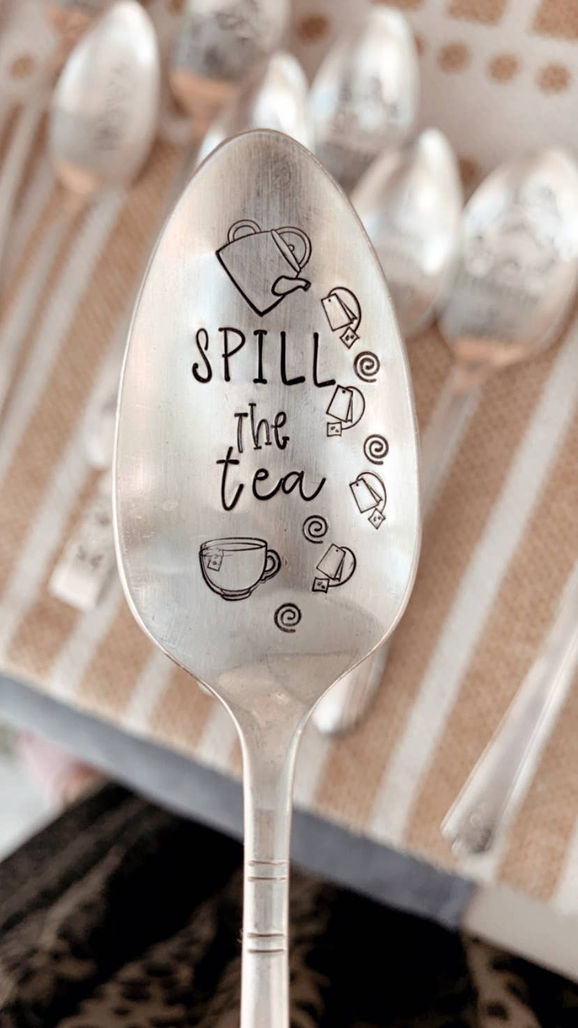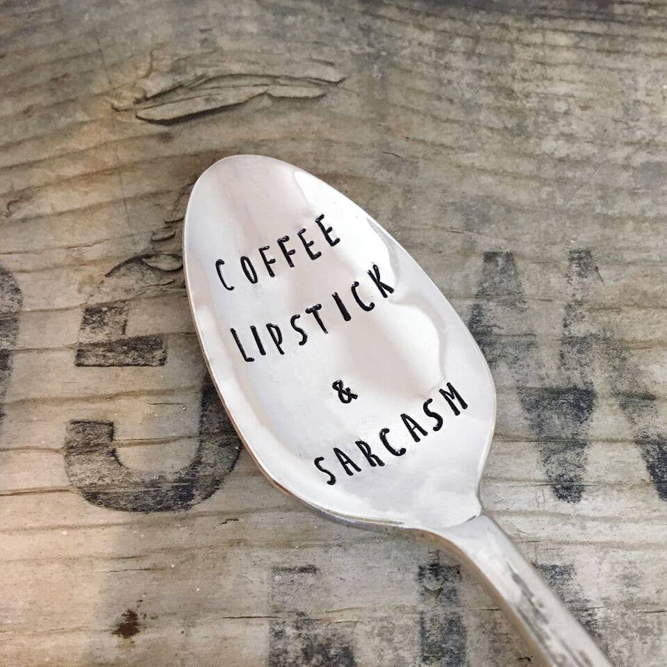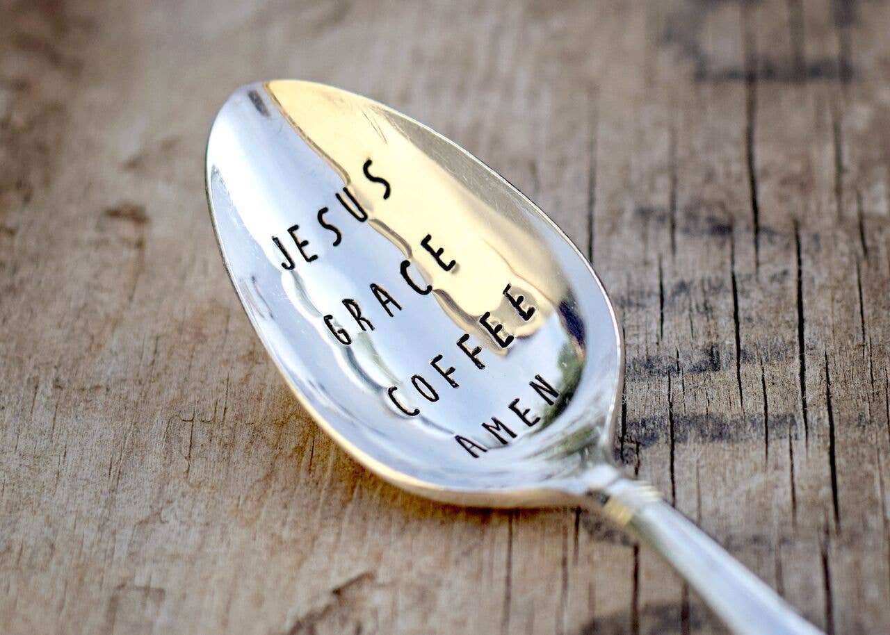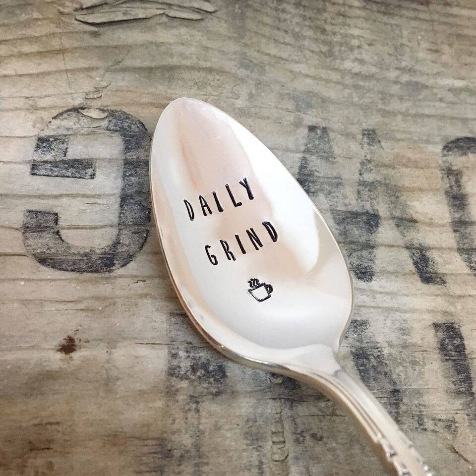 A selection of coffee themed teaspoons. Made from lovely vintage silver plated teaspoons. Spoons have a lovely patina of age and gentle use. Hand-stamped. Handle patterns will vary. Items come individually packaged and ready for gift giving.