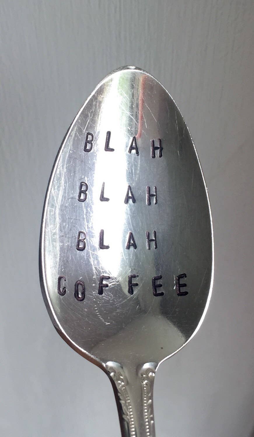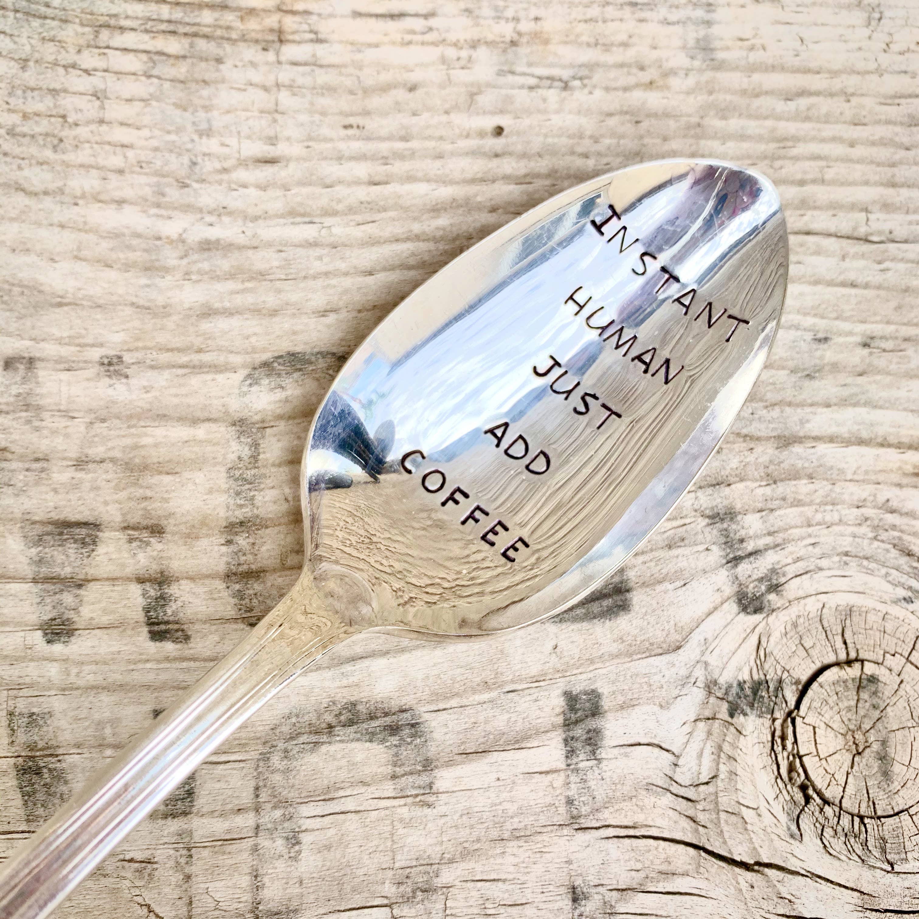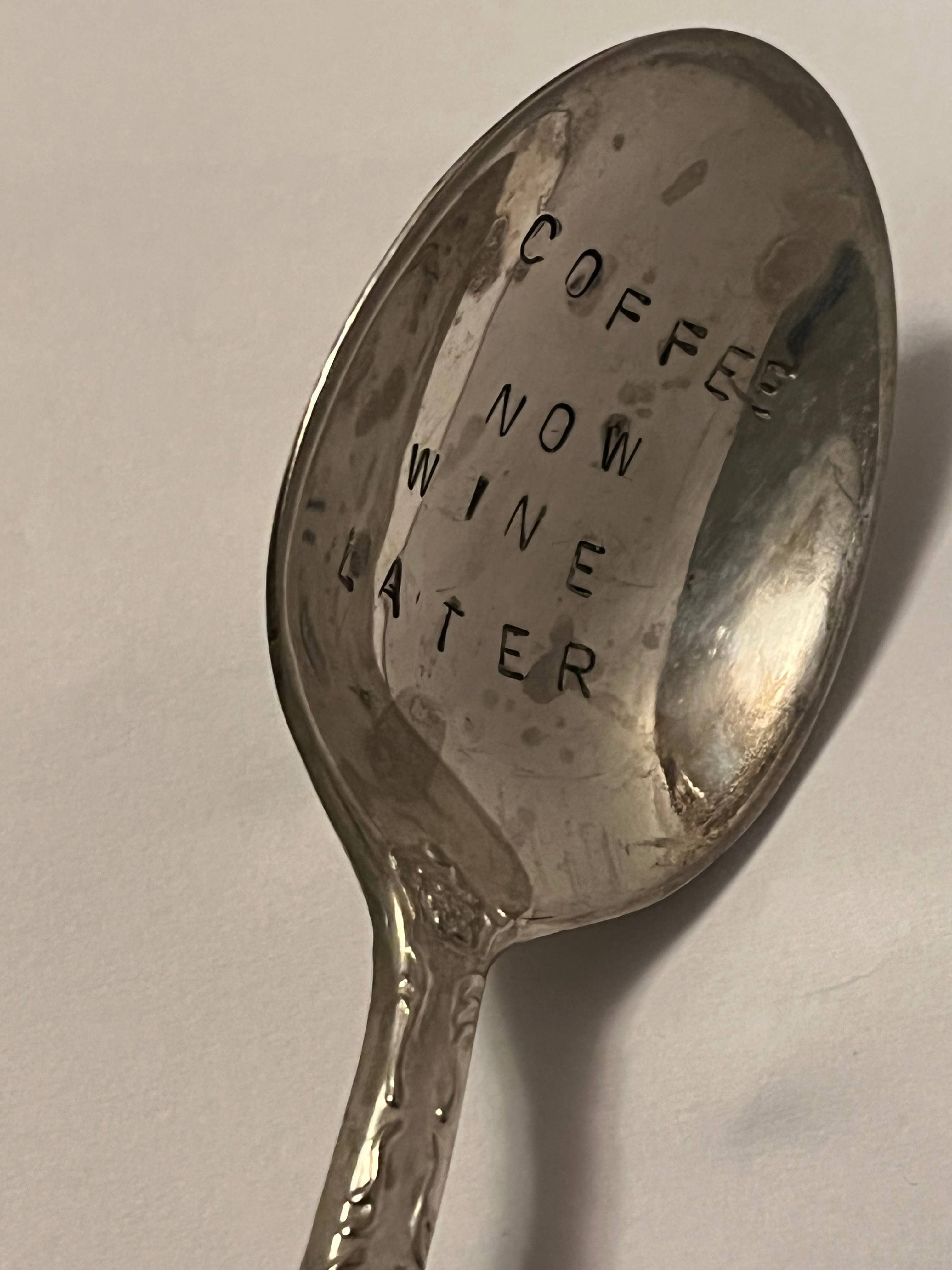 A selection of coffee themed teaspoons. Made from lovely vintage silver plated teaspoons. Spoons have a lovely patina of age and gentle use. Hand-stamped. Handle patterns will vary. Items come individually packaged and ready for gift giving.