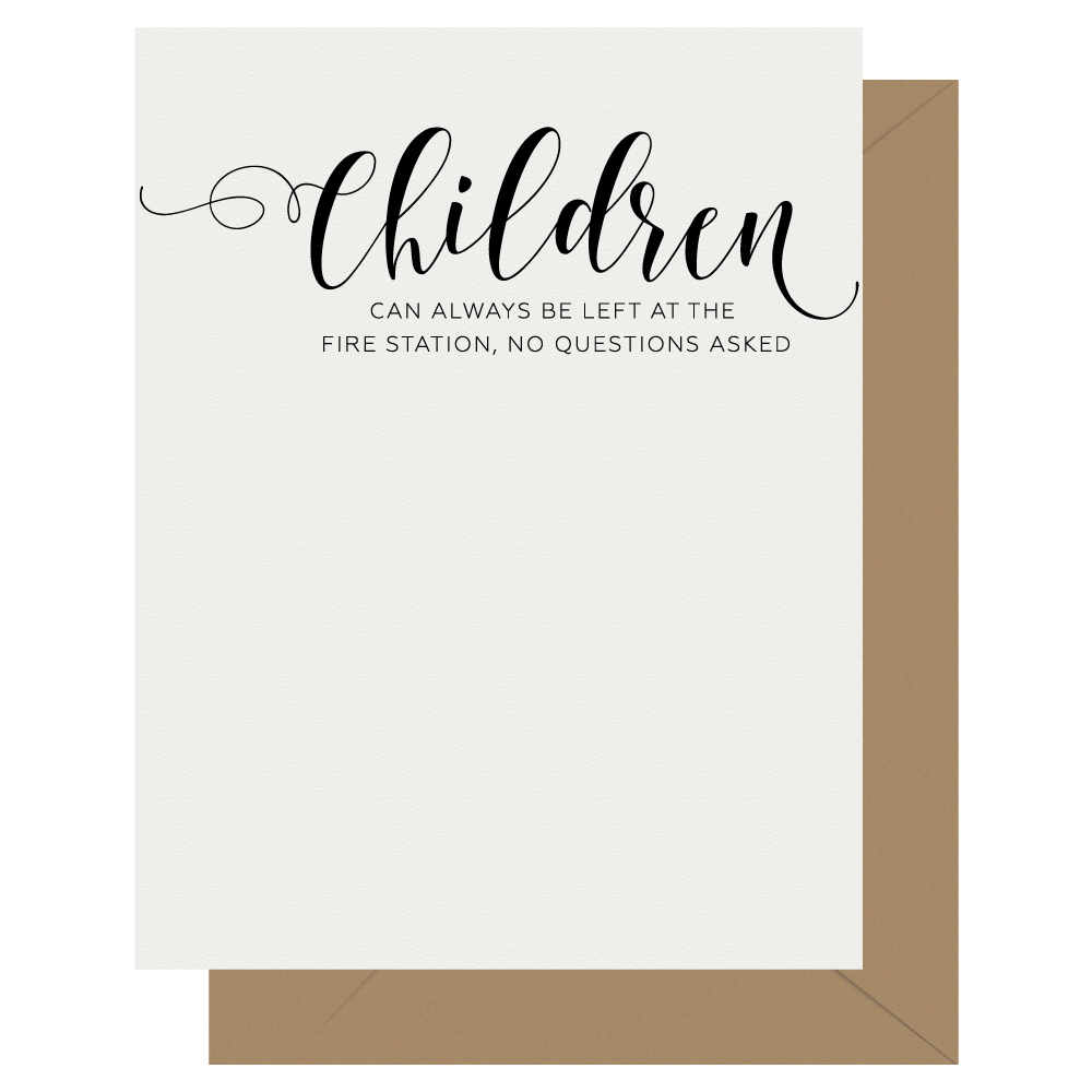 the original hat+wig+glove card line offers something mildly offensive for almost everyone you know. from discouragement to blunt observations, we've got you covered. if there were no children, i'd love to be a stay at home mom - 1-color letterpress on 3.5 x 5 inch grey cotton paper card - packaged with a grey envelope and in clear sleeve - available as single cards