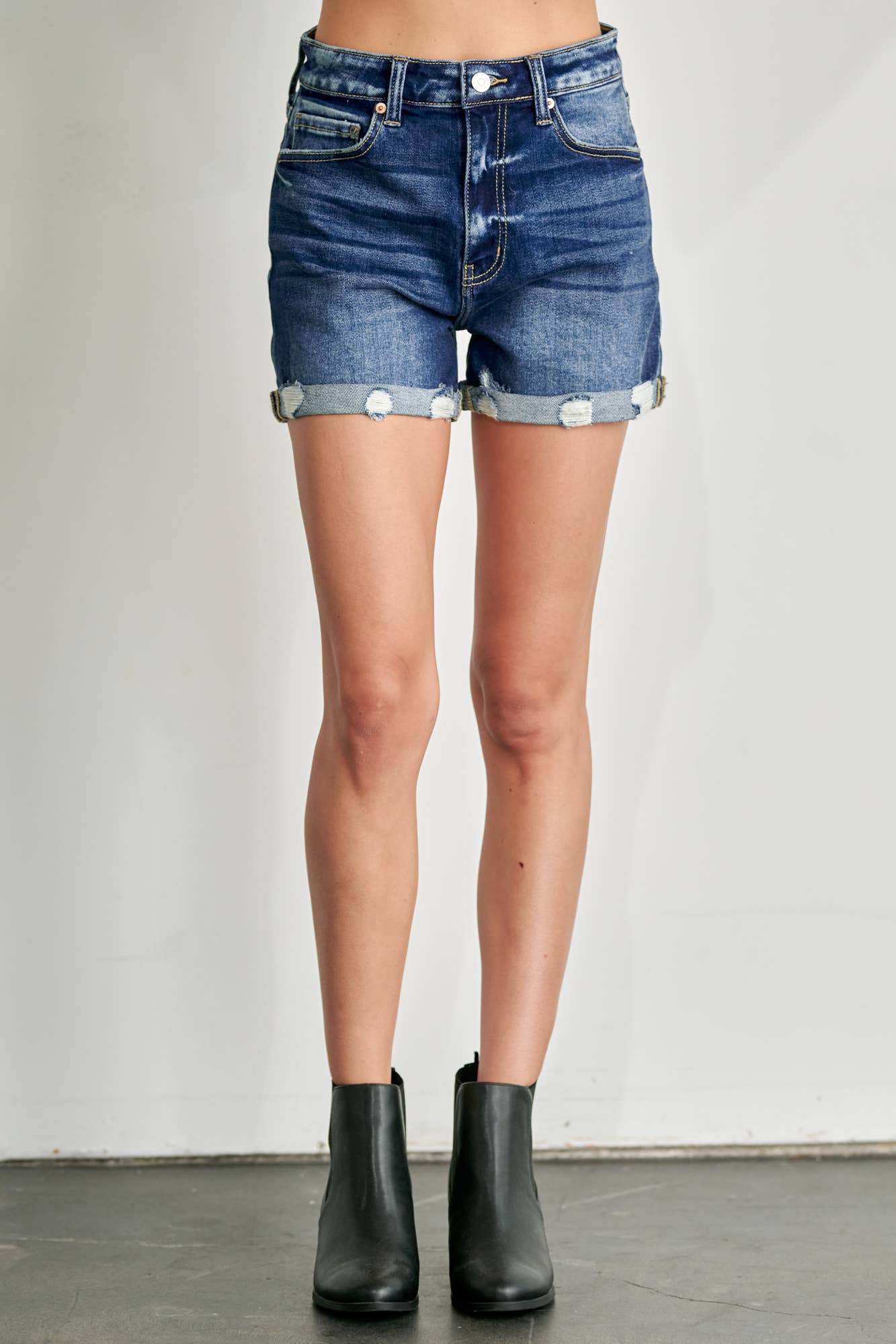 Crossover denim shorts feature an overlapping waistband for a stylish, asymmetrical look. Flattering and trendy, they pair effortlessly with any top for a chic, casual vibe. * CROSSOVER WAIST * ECO FRIENDLY FABRIC * LIGHT STONE WASH * FRAYED HEM * DISTRESSED FRONT RISE : 10 1/2" INSEAM : 4"