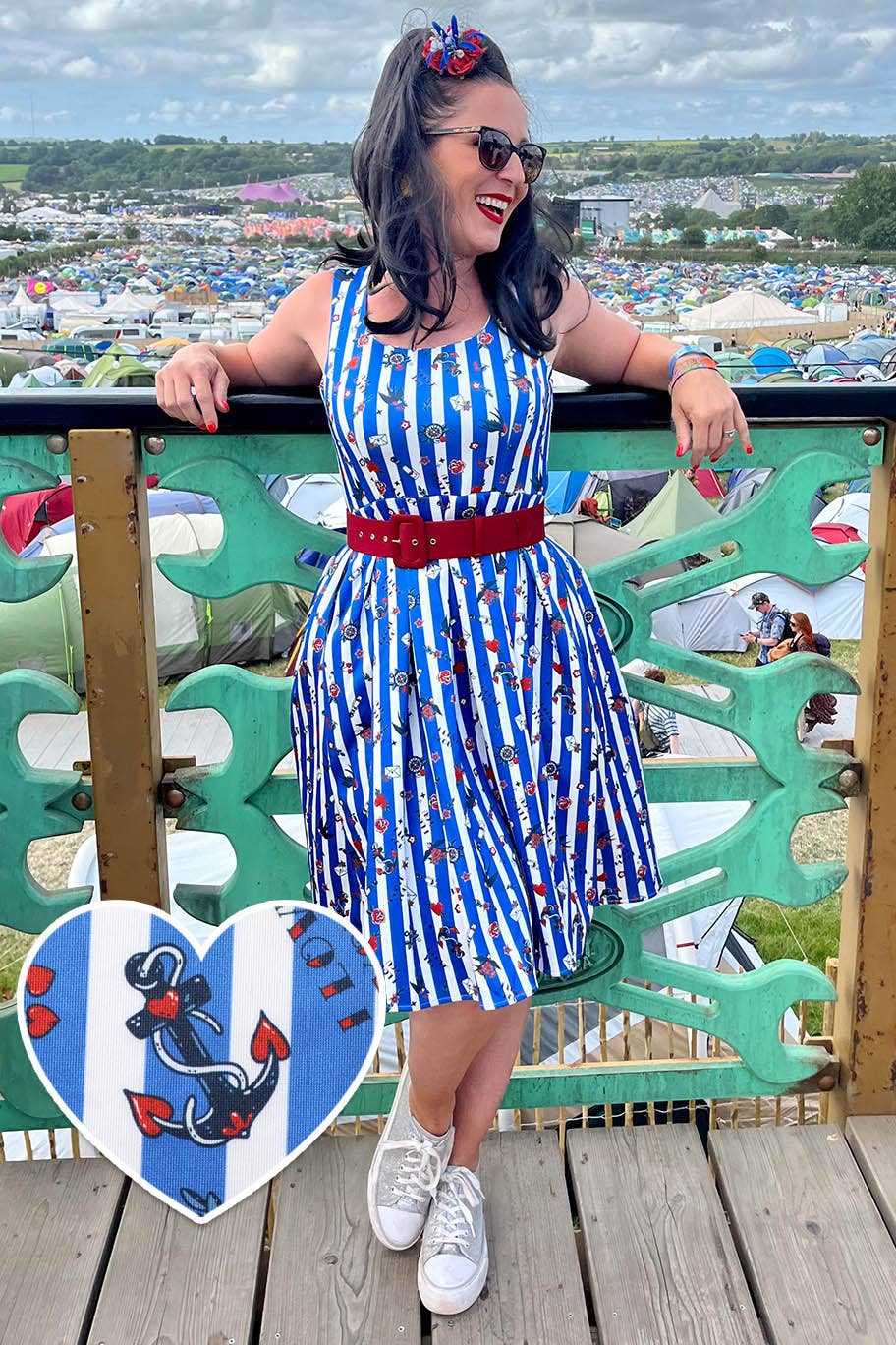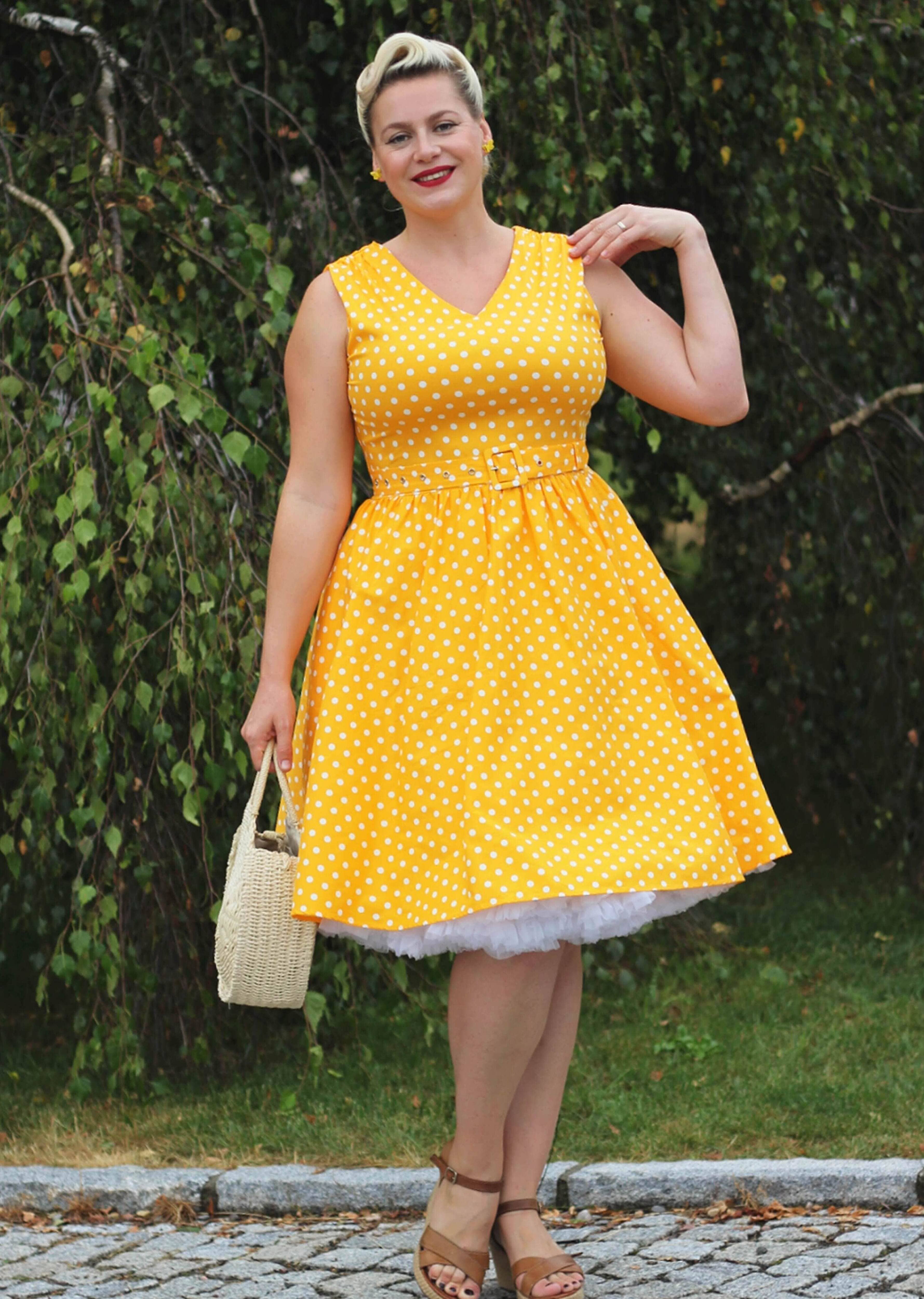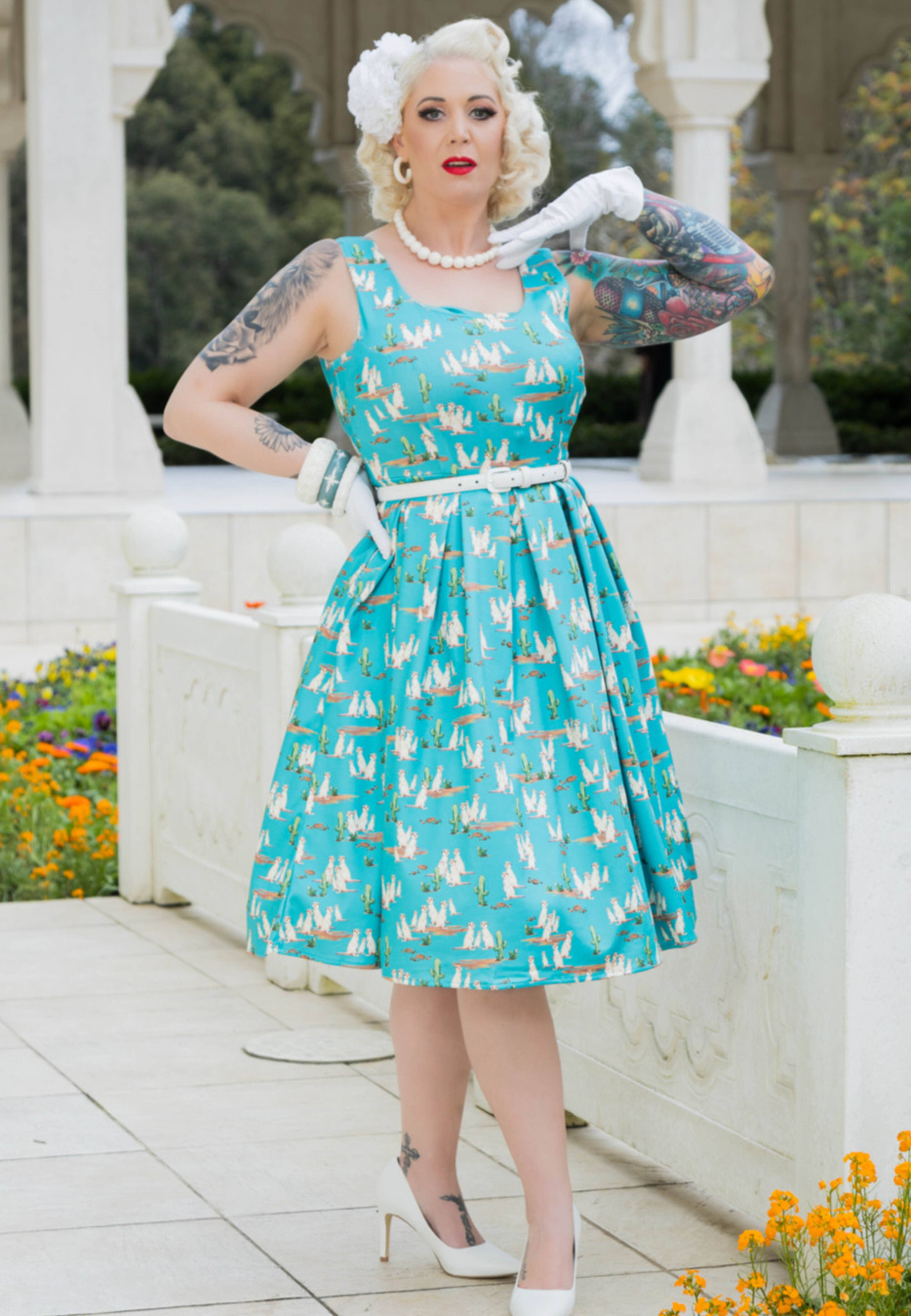 Your customers will be transformed into a rebellious rockabilly chick with our classic 1950s swing dress. This fifties frock has a cute V neckline, a full circle swishing 1950s skirt and adorable gathers around the shoulders and waist. The dress fastens at the back with a concealed zip and is made from soft cotton with stretch. Print: Aqua Polka Dot