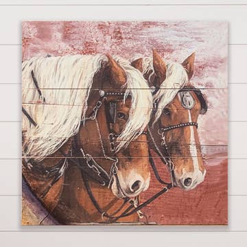 Four horses grace the front of this hanging wall Plaque. The image is on 1/8" lightweight wood and highlighted with hand painted sparkling glitter. The wall hanging arrives ready to hang with matching satin ribbon. All materials used for this wall hanging are from the USA, eco-friendly, toxic-free and from sustainable sources.