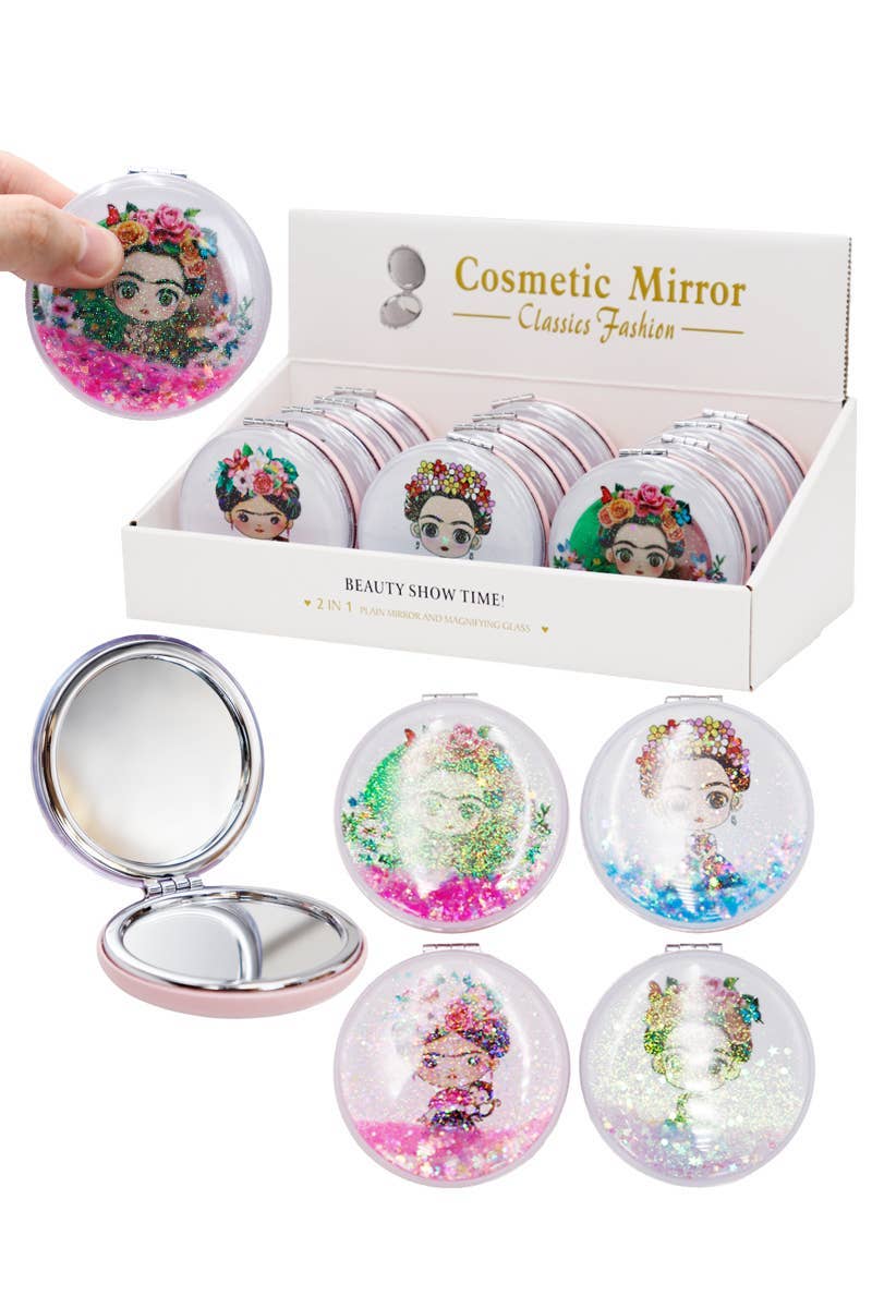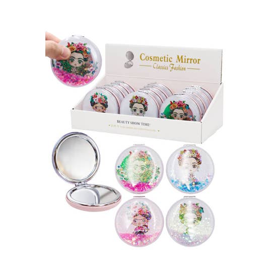 Assorted pocket mirrors featuring various fancy cats! There are three different designs including: Queen Cat - a tabby cat with a golden crown Frida Cat - a cat with a floral crown Caesar Cat - a white cat with a golden crown Each design features a related circular border. Each mirror measures 2.25 inches around and is printed in full color on recycled paper.