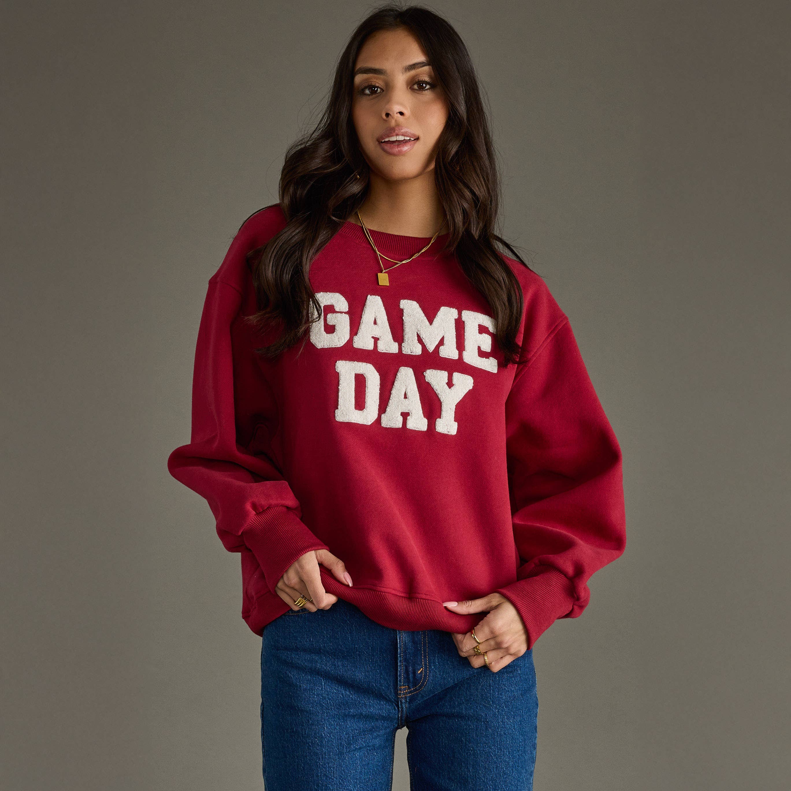 Celebrate game day in style with this eye-catching graphic long sleeve top. Stay cozy and comfortable with the corded fabric that adds a unique texture. The crew neck design offers a classic and versatile look for any occasion. Long sleeves provide extra warmth and coverage during cooler days.