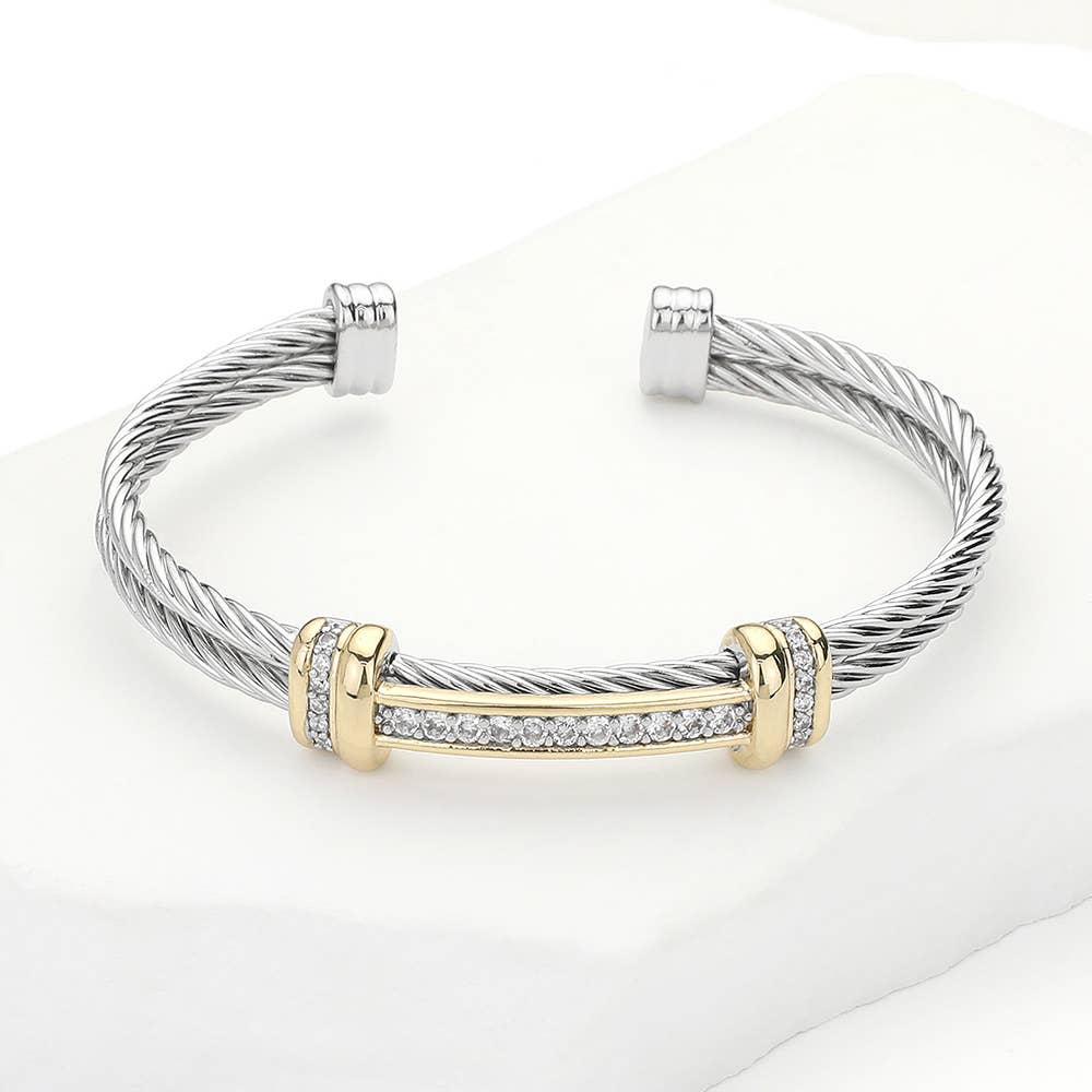 Get the best of both silver and gold with this titanium bracelet. This cuff bracelet features a silver cable wire base, which is adorned with gold ends that give it a special look. This fairs well with any skin tone and is a great piece of elegant jewelry. Pair with its silver counterpart for a beautiful jewelry set! Product Details: Silver tone titanium Gold tone accent ends Approx. 2.5" & adjustable Clasp: wrap