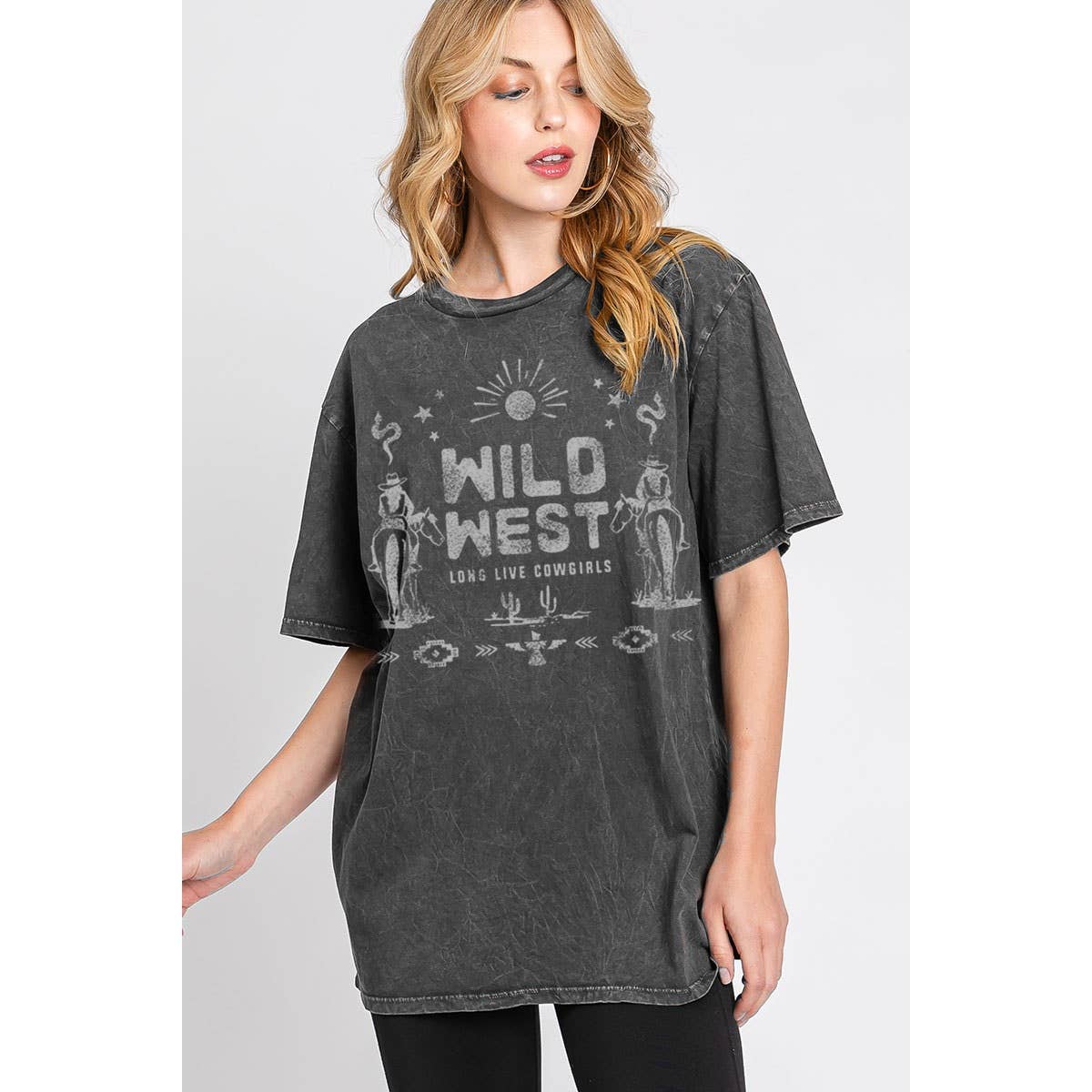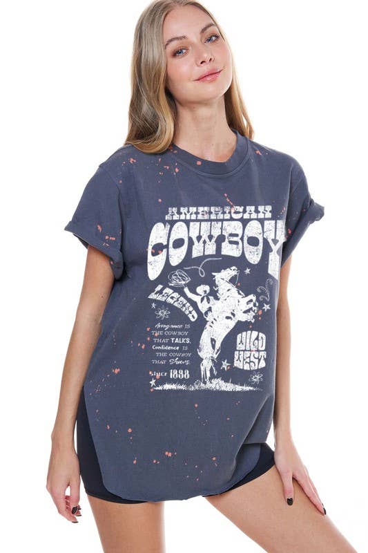 WILD WEST LONGHORN GRAPHIC, PREMIUM COTTON BLEACH SPLATTER DOLPHIN HEM TEE WITH RAW EDGED DETAILS