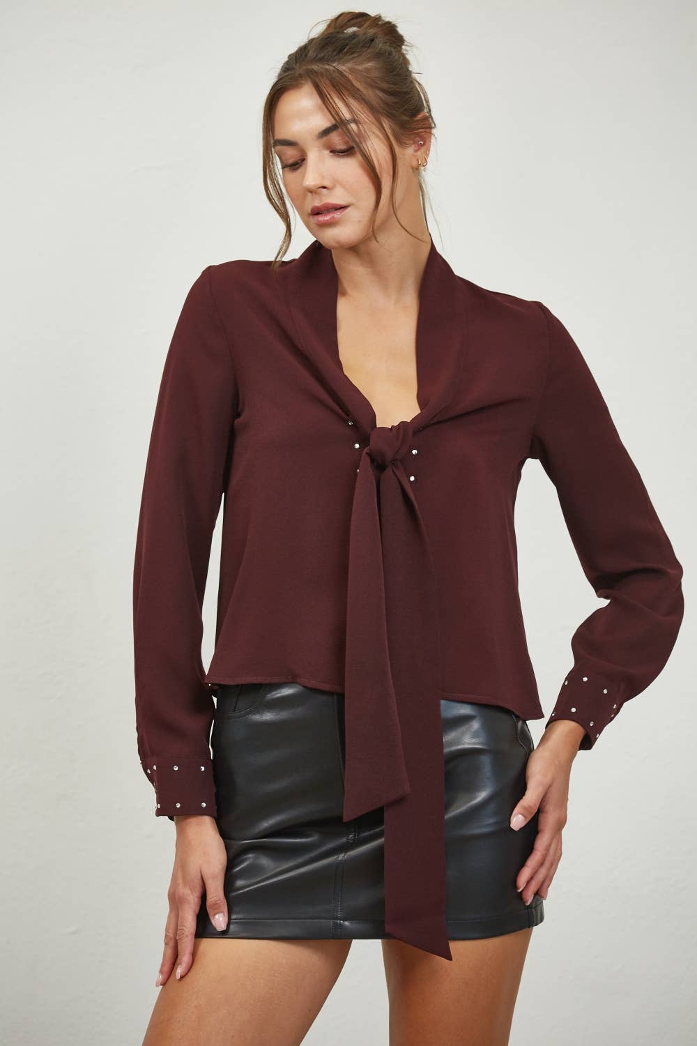 Get a little fancy. This shiny long sleeve blouse ties at the neck, has shirring on the shoulder, and 1" cuff sleeve with keyhole button closure. [ size/fit, fabric ] Length from shoulder to hem: 24 1/2" Across chest: 20" Sleeve length: 23 1/2" 92% Poly 8% Spandex Model is 5'9" wearing size S