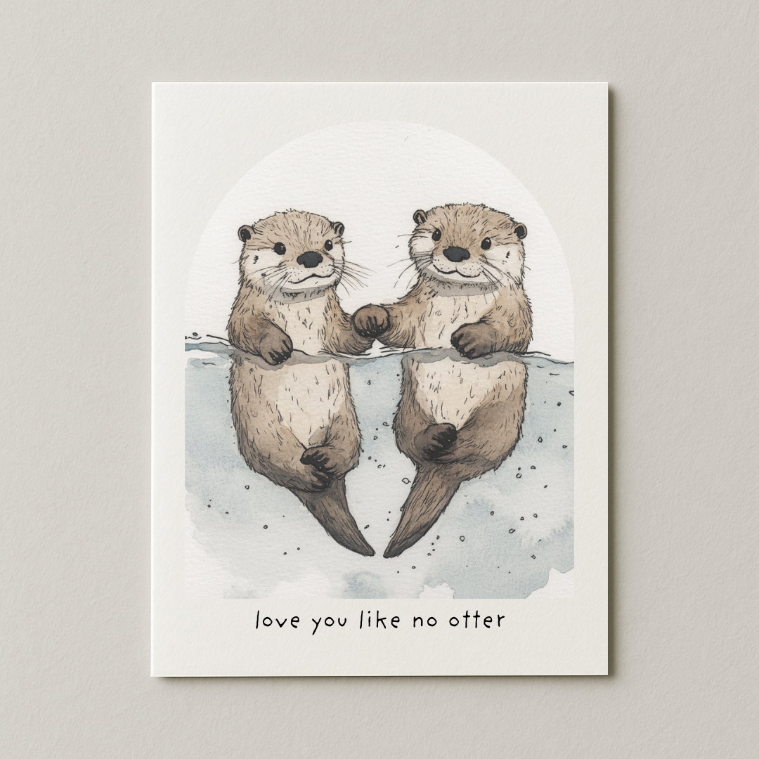 Send your significant otter or anyone else you'd hold paws with some love with this A2 size digitally printed greeting card featuring original hand lettering and illustration. Each card comes with a brown kraft-paper envelope and comes individually sealed in a cellophane sleeve. Inside is blank. __________________ Wholesale customers: you must purchase this item in increments of 6 to be eligible for wholesale pricing.
