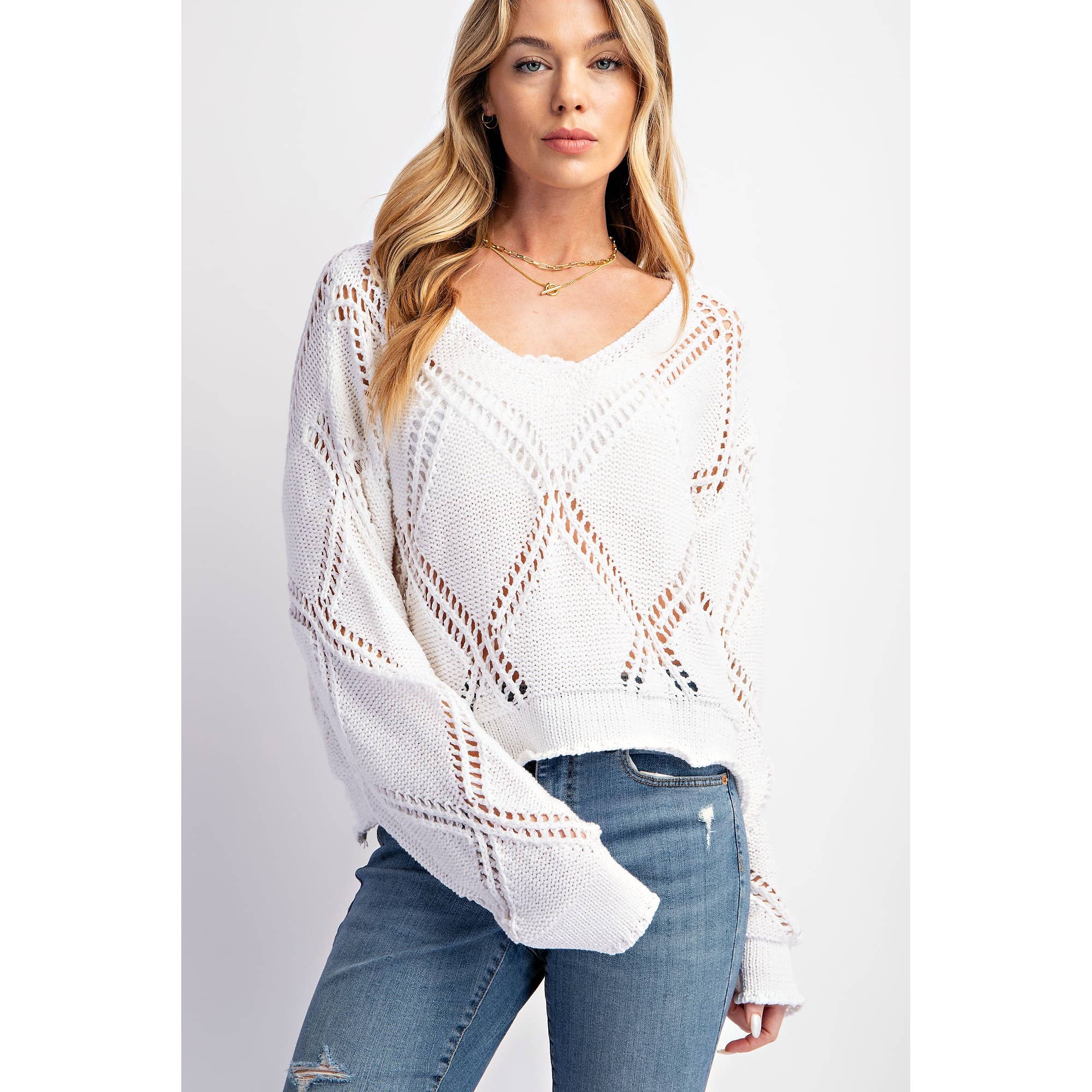 ITALIAN STAR CROCHET SWEATER THIS STAR CROCHET SWEATER IS SURE TO PROVIDE STYLISH LAYERING FOR ANY SEASON. LIGHTWEIGHT AND BREATHABLE, IT FEATURES A BEAUTIFUL LACE PATTERN, PLUS SUBTLE LOGO DETAIL FOR ADDED CHARACTER. PERFECT FOR ADDING A TOUCH OF EXTRA WARMTH WHEN THE WEATHER DIPS. ENJOY WARMTH WITHOUT THE WEIGHT.