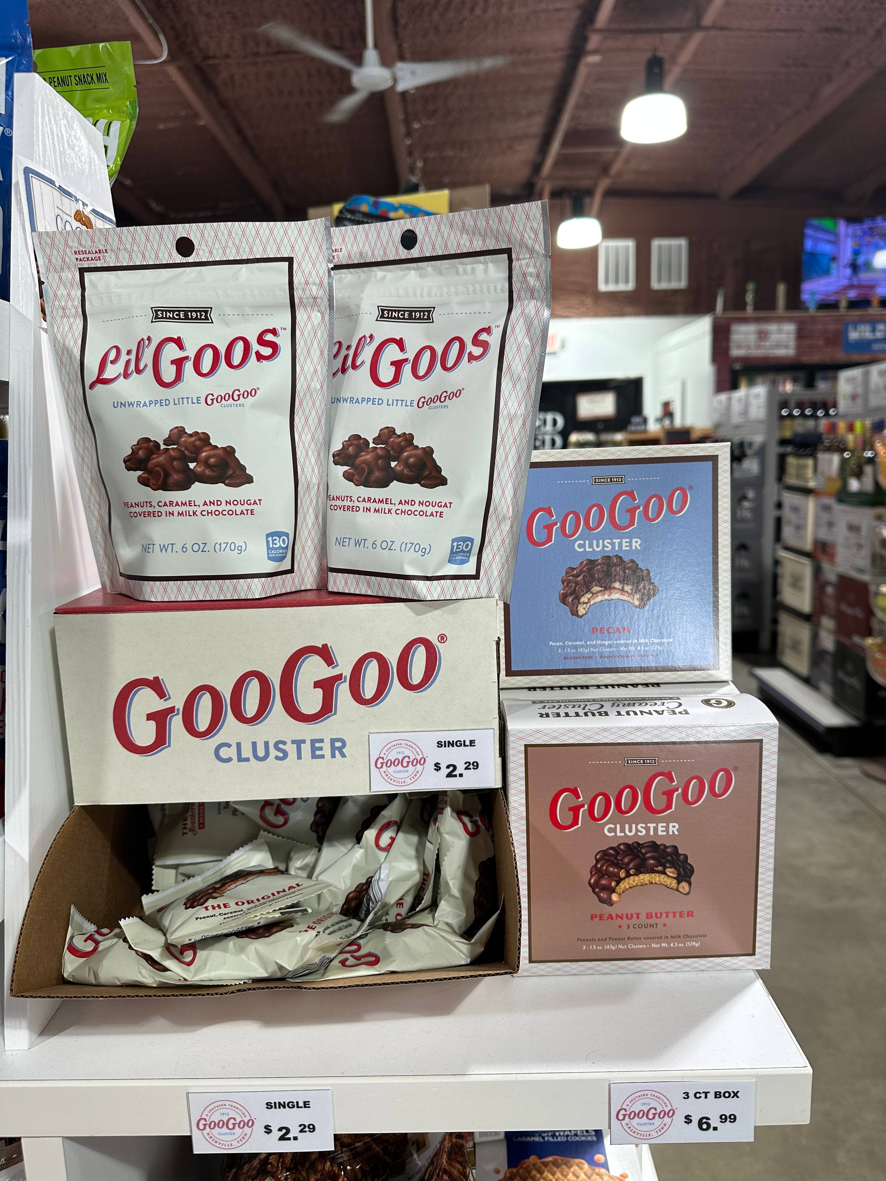 The Pecan 3-pack box contains 3 single wrapped Pecan Goo Goo Clusters. Ships 12 cartons to a case. Case Pack: 12 Cartons SRP per carton: $7.99