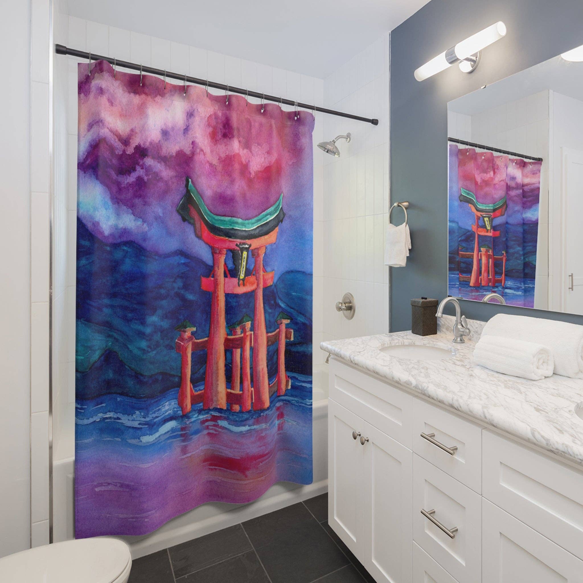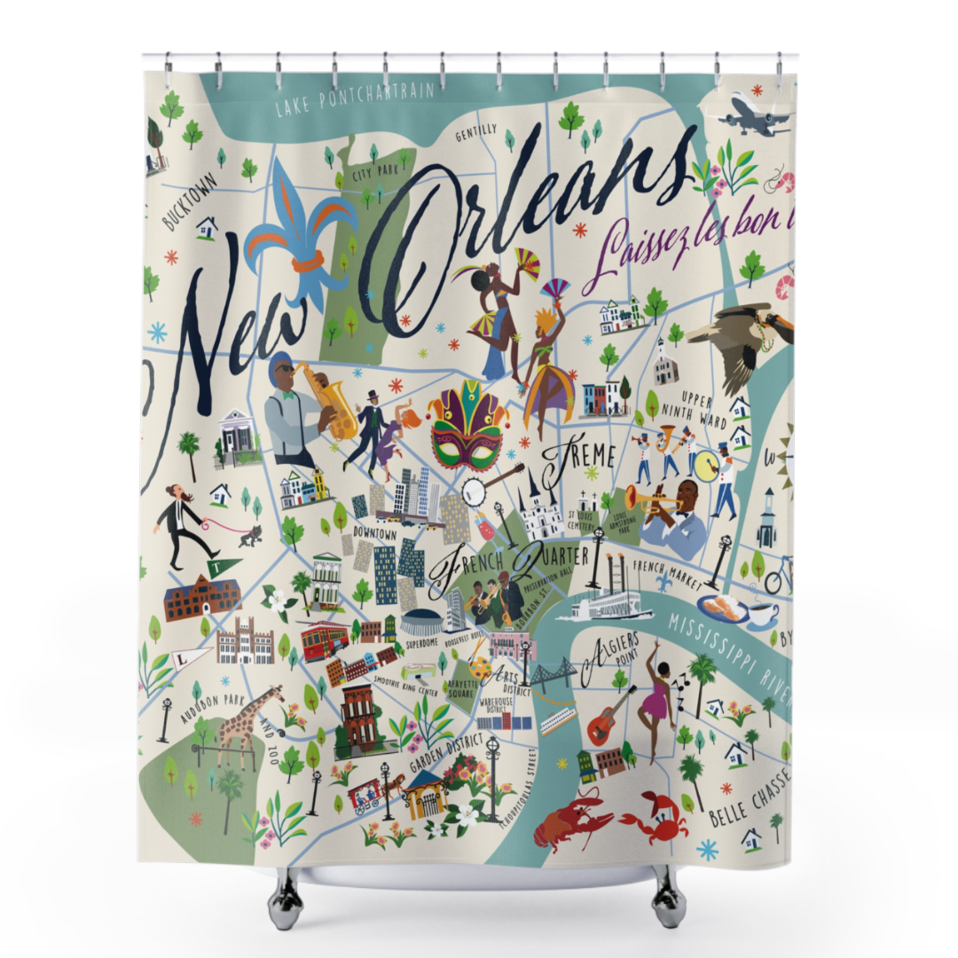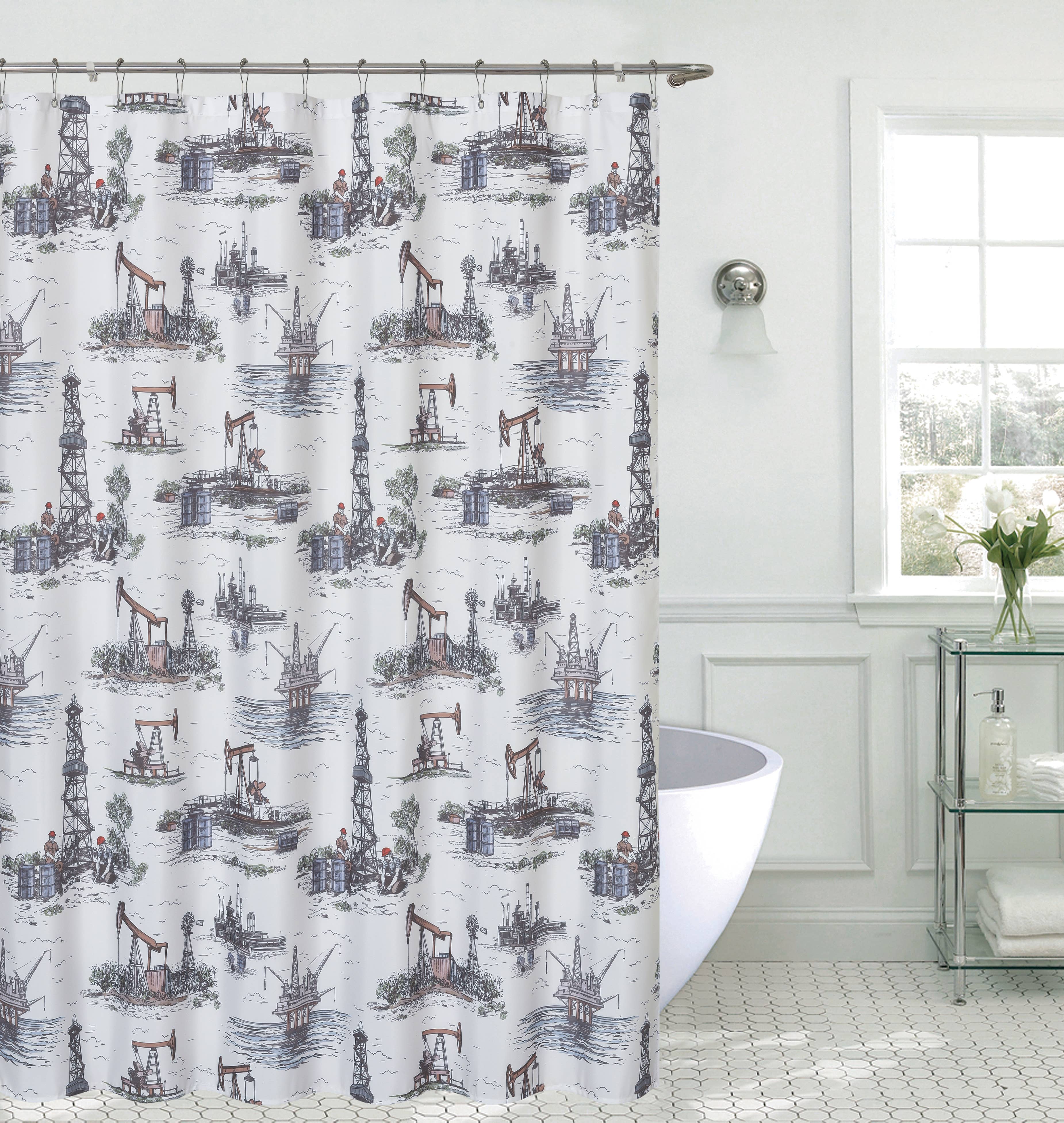 Colorful coastal-themed shower curtains from Betsy Drake. Our shower curtains measure 70 inches x 72 inches and are sure to brighten up any bathroom. All of our products are based on designs by artists R.B. Hamilton and Betsy Drake and are printed in the USA from imported materials.