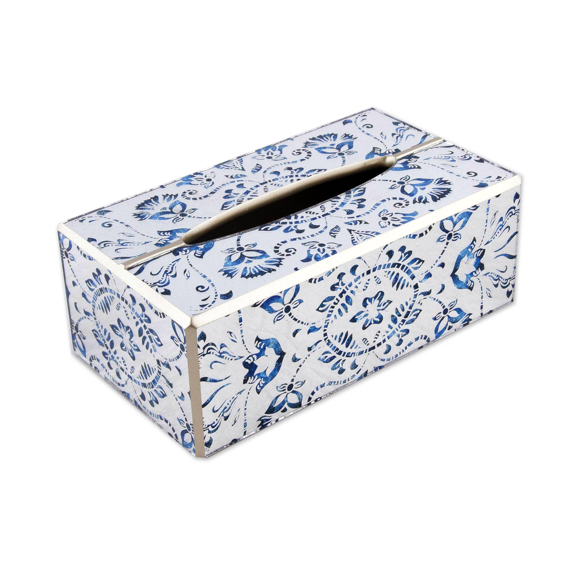 Our decoupage tissue box covers are handmade to order by our wonderful team in Houston, TX. They easily slide over any cubed tissue box cover. The artwork is hand-cut, decoupaged, and polished. Each tissue box cover is hand painted in gold or silver around the edges as the finishing touch. We offer 3 materials for the tissue box covers: 1. Papier Mache: $19 Dimensions: 5.5” H x 5” W x 5” L 2. Wood: $30 Dimensions: 5.25” H X 5” W X 5” L 3. Tin: $30 Dimensions: 5.75” H x 5.125” W x 5.125” L